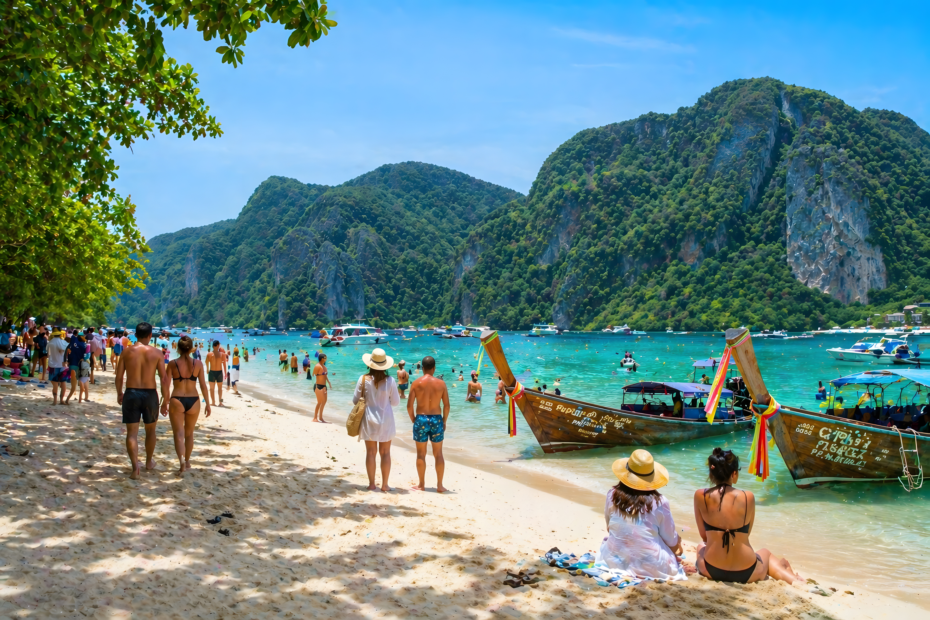 Dieses lebhafte Strandfoto zeigt einen belebten Sandstrand in Thailand, sehr wahrscheinlich auf den Phi-Phi-Inseln. Im Vordergrund spazieren Touristen in Badebekleidung entlang des weißen Sandstrandes, während zwei Frauen sitzend die Aussicht genießen. Traditionelle Longtail-Boote mit farbenfrohen Bändern liegen direkt am Ufer, dahinter erstreckt sich das türkisblaue, klare Wasser der Bucht.