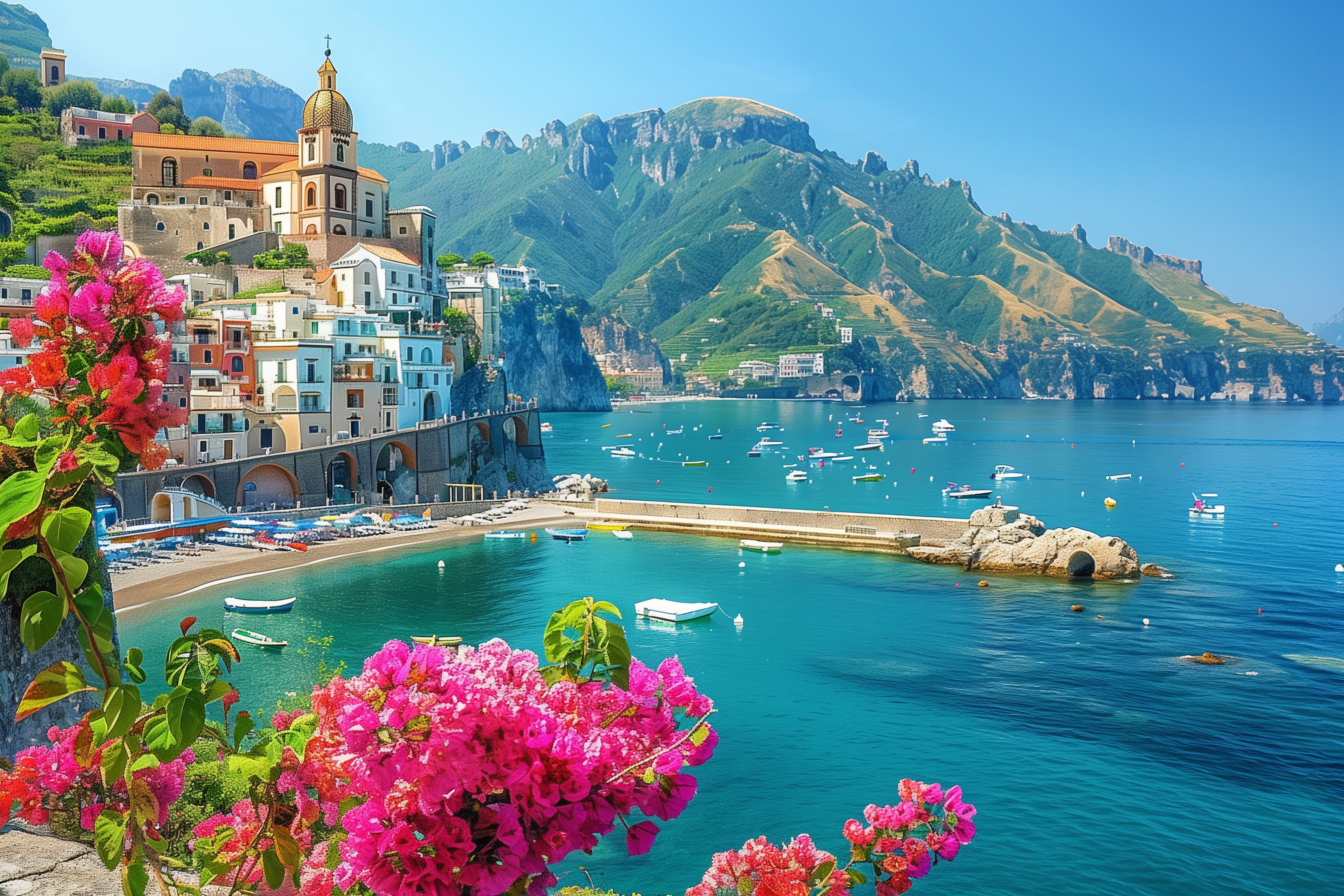 Das Bild zeigt eine malerische Küstenstadt in Italien - Amalfi. Die bunte Stadt mit Häusern in verschiedenen Pastellfarben ist an einem Bergabhang gelegen und blickt auf das türkisfarbene Mittelmeer hinaus. Im Vordergrund sieht man farbenfrohe Blumen, die den Kontrast zu den blauen Gewässern und den orange-roten Dächern bilden. Im Hintergrund ragen hohe Bergketten empor, die die Szenerie umrahmen. Boote und Schiffe in den Gewässern runden das idyllische Bild ab.