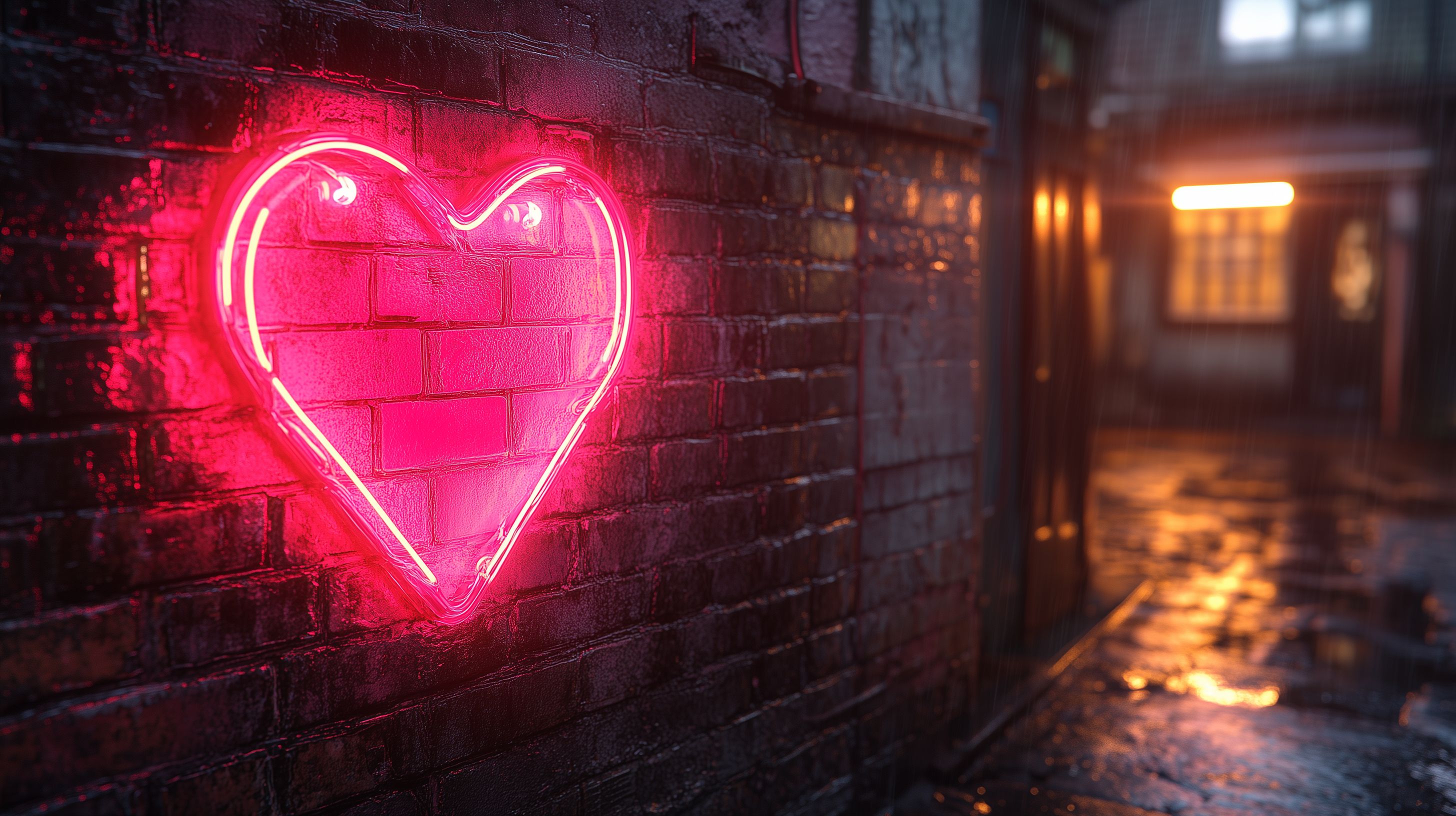 Das Bild zeigt ein leuchtendes, neonpinkes Herzsymbol, das an einer regennassen Backsteinwand in einer dunklen Gasse angebracht ist. Das Motiv wird von weichen Lichtreflexionen auf dem nassen Mauerwerk umrahmt, was eine stimmungsvolle, romantische Atmosphäre schafft. Dieses Foto eignet sich hervorragend für den Einsatz in Blogbeiträgen, Newsletter-Layouts, Social-Media-Posts oder Werbematerialien zum Thema Liebe, Romantik und Valentinstag. Das hochauflösende Stockfoto steht unter einer Creative-Commons-Lizenz kostenlos zum Download zur Verfügung.