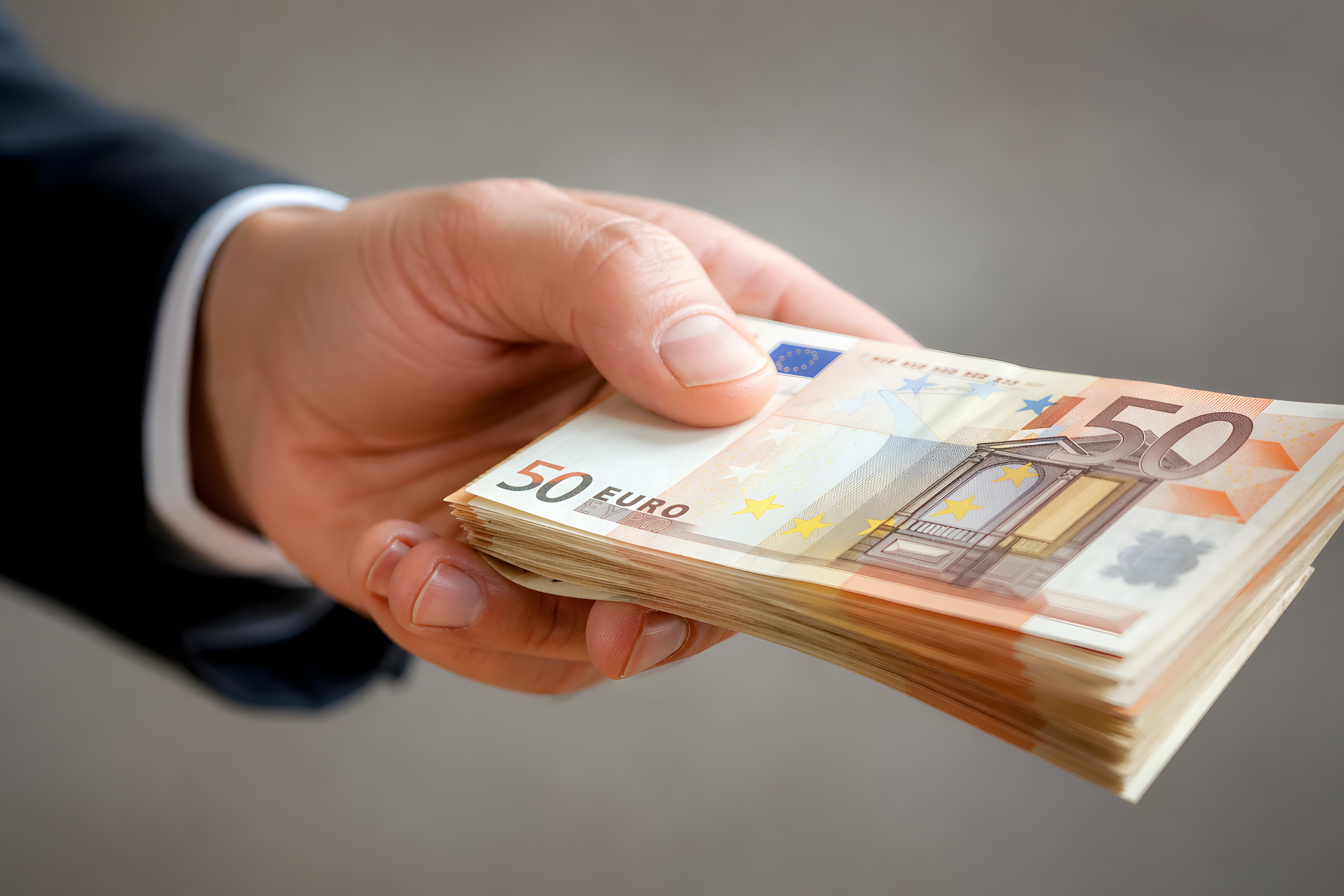 Das Foto zeigt eine Hand in einem dunklen Businessanzug mit weißem Hemdärmel, die einen dicken Stapel 50-Euro-Banknoten hält und ausstreckt. Die Geste wirkt wie eine Übergabe oder Zahlung und steht symbolisch für finanzielle Transaktionen, Investitionen oder wirtschaftliche Entscheidungen.
