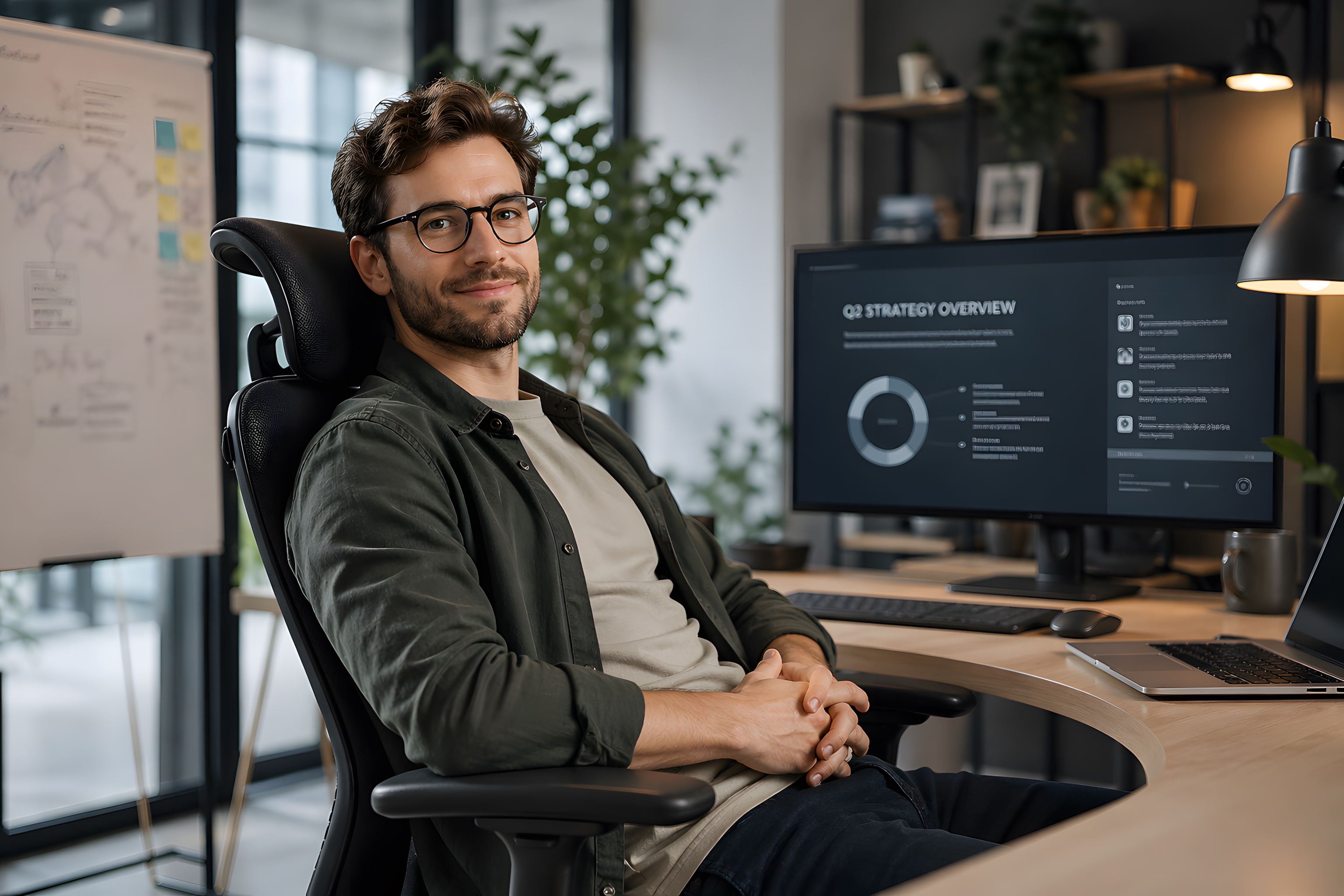 Im Hintergrund ist ein großer Monitor sichtbar, auf dem eine Strategie-Präsentation mit dem Titel «Q2 Strategy Overview» zu sehen ist, ergänzt durch Diagramme und strukturierte Inhalte. Links im Bild hängt ein Whiteboard mit handgeschriebenen Notizen und bunten Haftnotizen. Ein Laptop, eine Tastatur sowie eine Schreibtischlampe vervollständigen den modernen Arbeitsplatz. Grüne Zimmerpflanzen und warmes Licht sorgen für eine angenehme, kreative Atmosphäre.