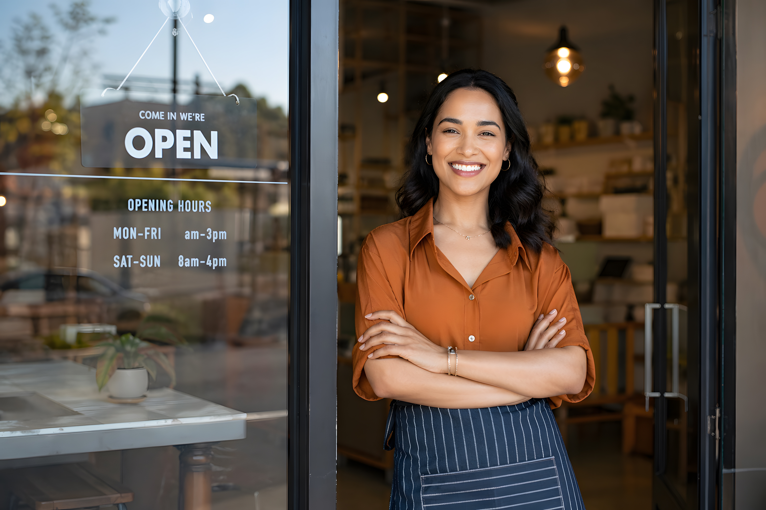 Dieses professionelle Foto zeigt eine junge Frau, die lächelnd und mit verschränkten Armen in einem Türeingang eines kleinen Cafés oder Ladengeschäfts steht. Sie trägt eine orangefarbene Bluse und eine dunkle gestreifte Schürze, was auf eine Tätigkeit im Gastronomie- oder Einzelhandelsbereich hinweist. Ihr selbstbewusstes Auftreten und ihr strahlendes Lächeln vermitteln Freundlichkeit und Stolz auf den eigenen Betrieb.