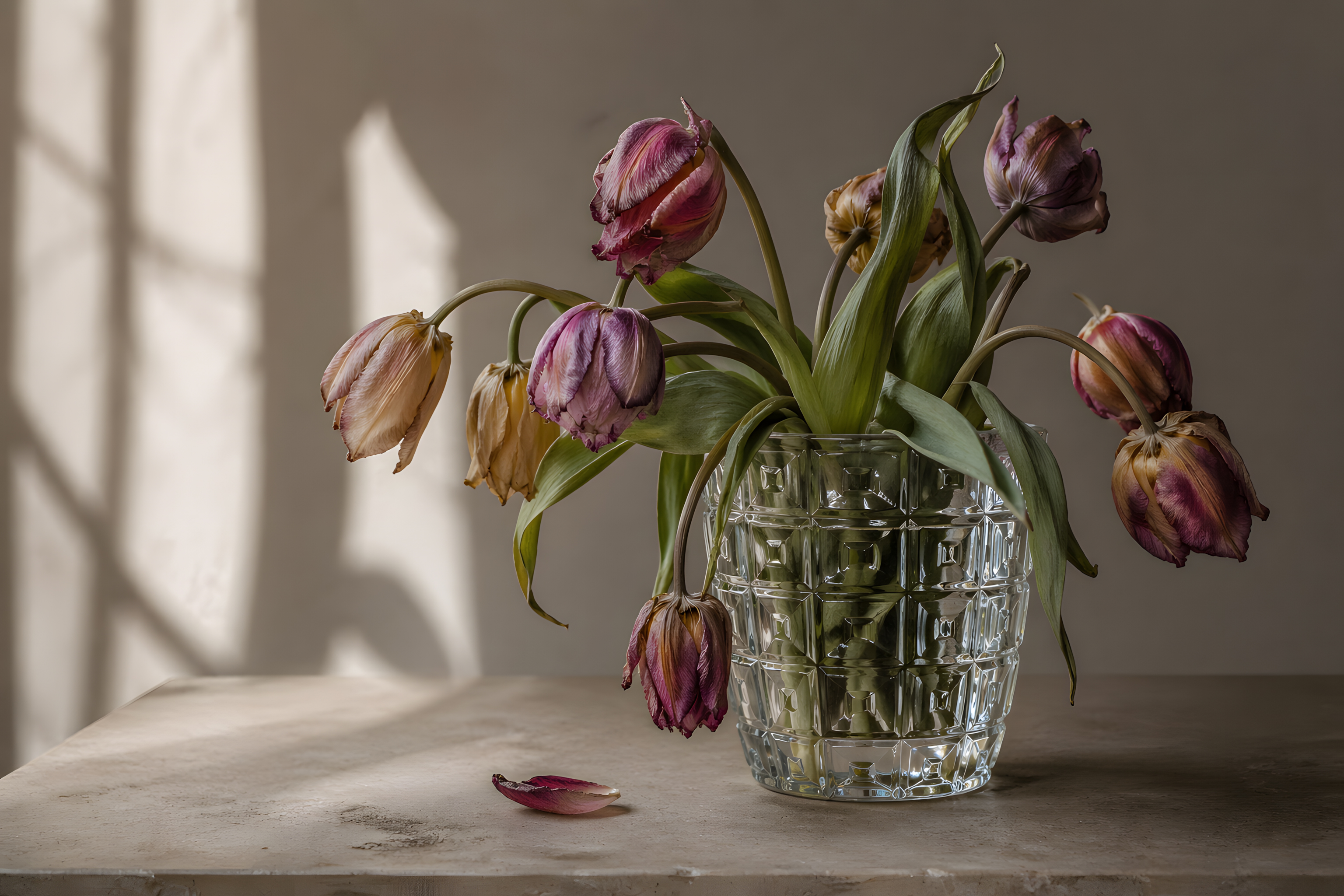Dieses stimmungsvolle Stillleben zeigt einen Strauß verwelkter Tulpen in gedämpften Lila- und Rosatönen, die in einer facettierten Kristallvase auf einer Steinoberfläche arrangiert sind. Die Blütenköpfe hängen sanft nach unten, ein einzelnes Blütenblatt liegt auf dem Tisch – ein starkes Bild für Vergänglichkeit und Schönheit im Verfall.