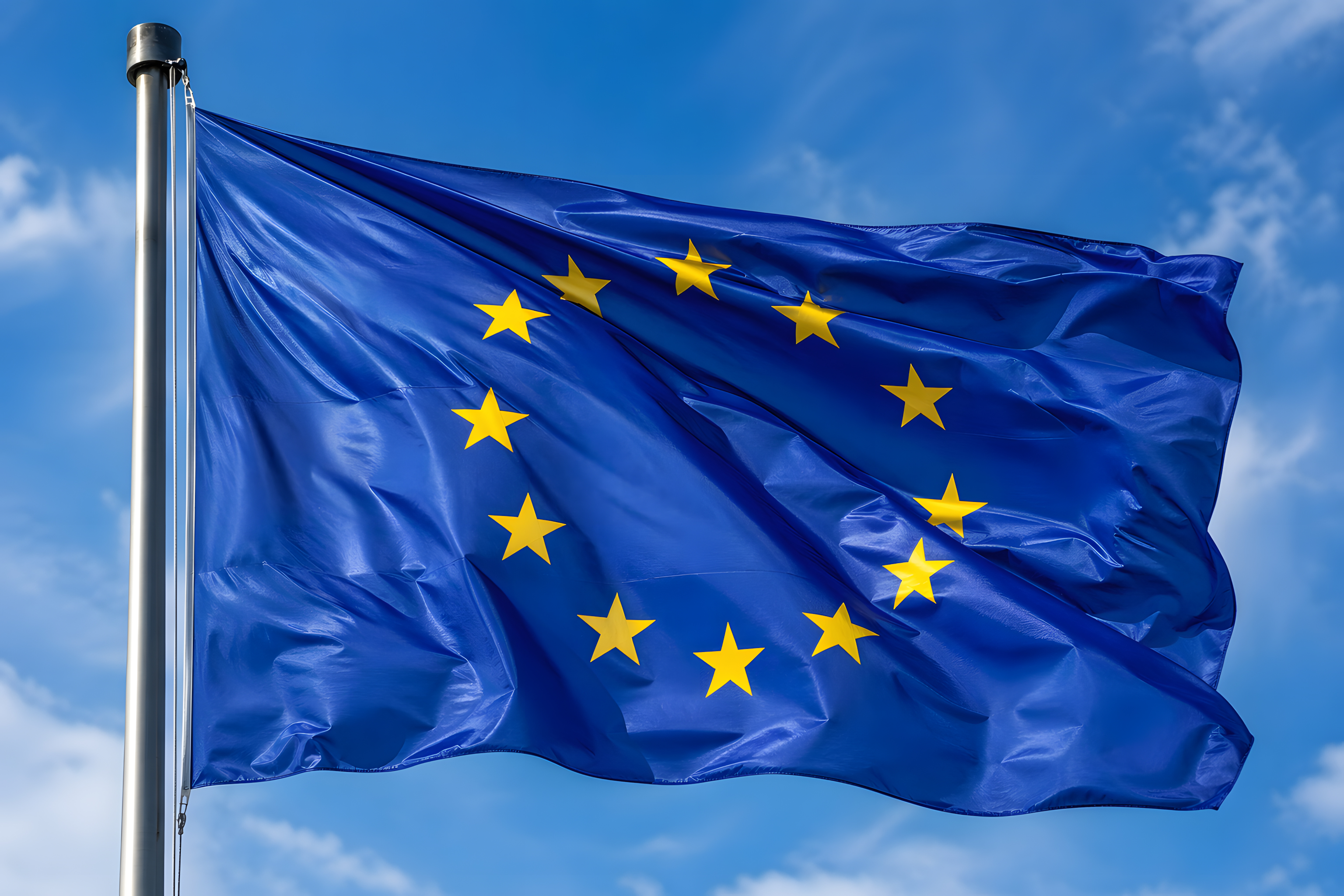 Diese beeindruckende Fotografie zeigt die Flagge der Europäischen Union, die kraftvoll im Wind weht. Die leuchtend blaue Flagge mit dem charakteristischen Kreis aus zwölf goldgelben Sternen ist in voller Dynamik festgehalten. Der Fahnenmast aus poliertem Metall ragt von unten links ins Bild und verleiht der Komposition Tiefe und Struktur.