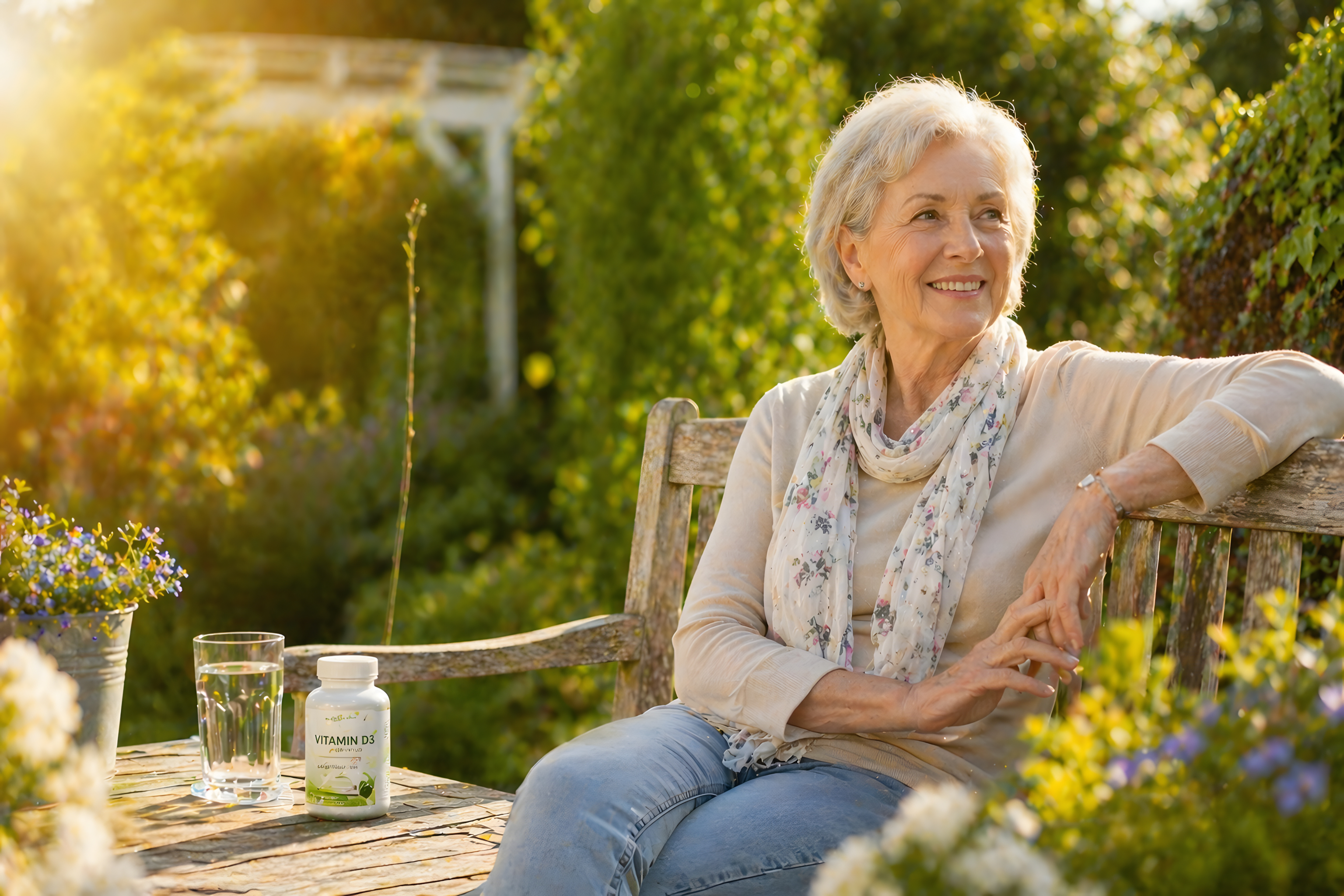 Auf dem verwitterten Holztisch vor ihr stehen ein Glas Wasser sowie eine weiße Flasche mit der Aufschrift «Vitamin D3» – deutlich erkennbar als Nahrungsergänzungsmittel. Die Szene ist in warmem Gegenlicht der goldenen Stunde aufgenommen, umgeben von üppigem Grün, blühenden Wildblumen in Lila und Weiß sowie einem weißen Gartentor im Hintergrund.