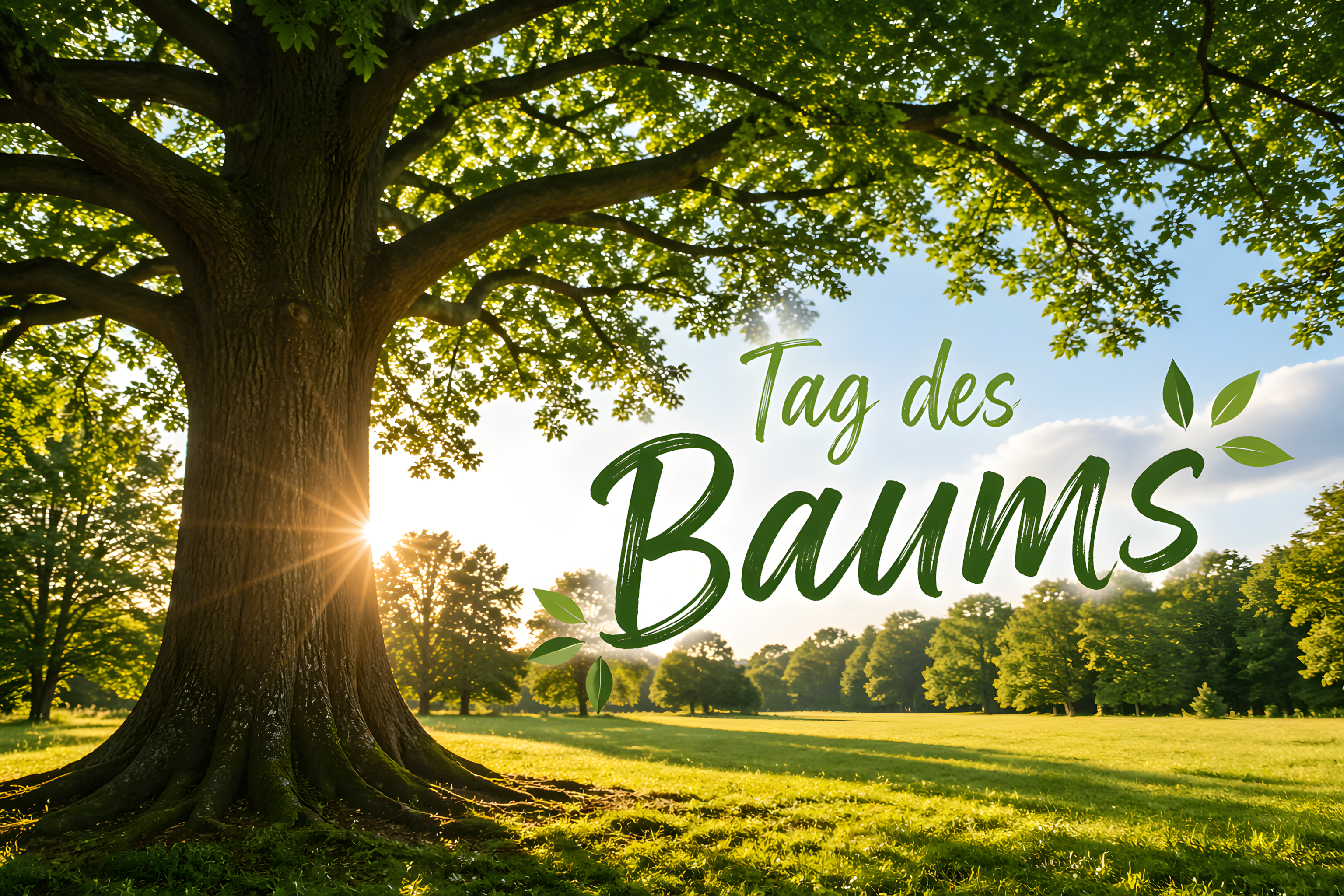 Über das Foto ist in großer, handgeschriebener Schrift der Text «Tag des Baums» in satten Grüntönen eingeblendet, ergänzt durch dekorative Blattmotive. Diese Komposition verbindet ein eindrucksvolles Naturfoto mit einer klaren Botschaft und eignet sich hervorragend als Social-Media-Post, Newsletter-Header, Blogbanner oder Präsentationsfolie rund um Themen wie Naturschutz, Nachhaltigkeit, Aufforstung und Umweltbewusstsein.