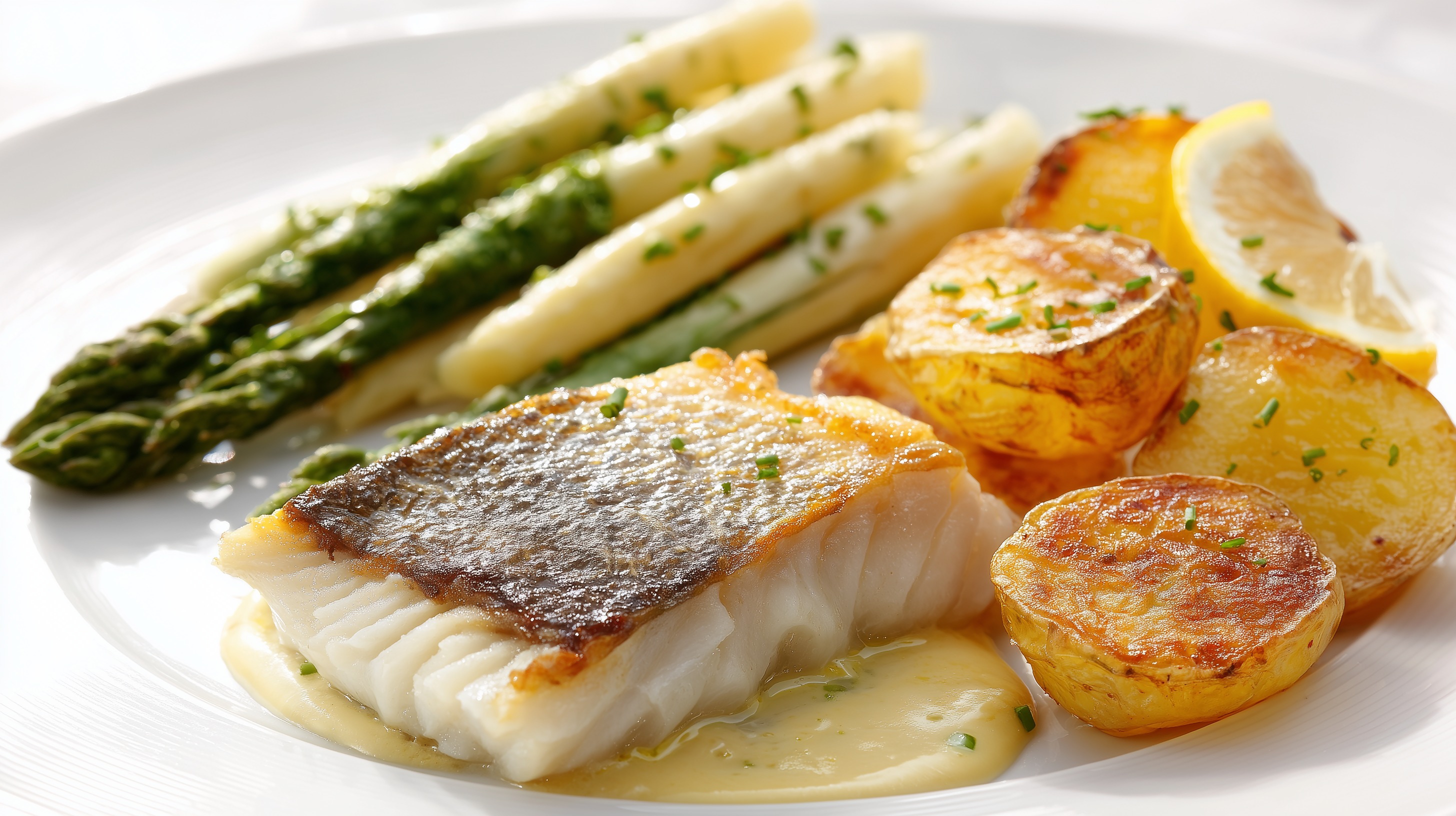 Tipp: Damit die Fischhaut wirklich knusprig wird, die Filets vor dem Braten unbedingt vollständig trocken tupfen und die Pfanne gut vorheizen. Wer möchte, kann zum Anrichten noch eine leichte Beurre blanc (Weißweinsauce mit Butter) dazureichen – sie passt hervorragend zu Seelachs und Spargel.