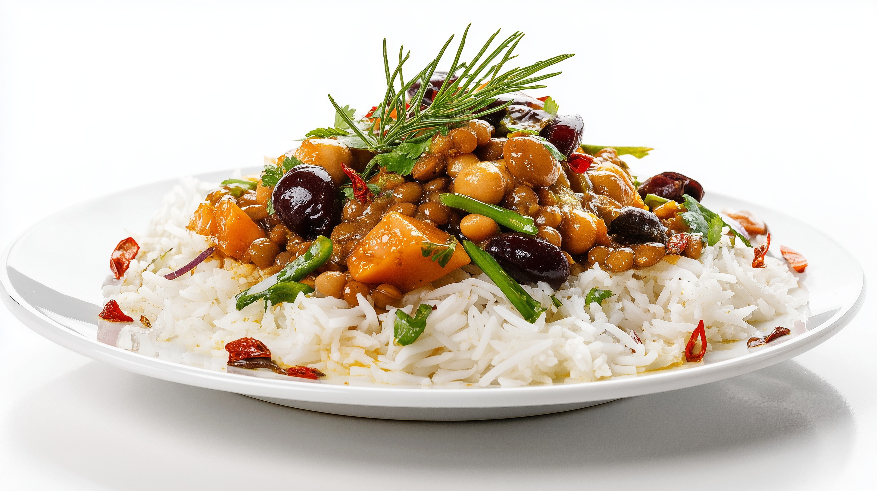 - Reis auf vier flache weiße Teller verteilen, das Linsen-Gemüse-Gemisch großzügig darüber geben. Mit frischer Petersilie, Dillzweigen und Chiliring garnieren und sofort servieren.