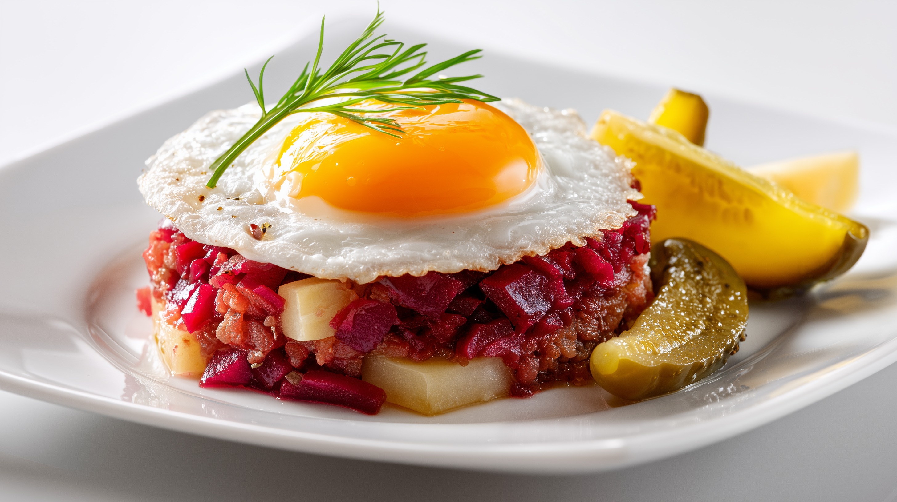 - Je ein Spiegelei auf jede Labskaus-Portion setzen, mit frischem Dill garnieren. Cornichons und Zitronenspalten daneben anrichten und sofort servieren.