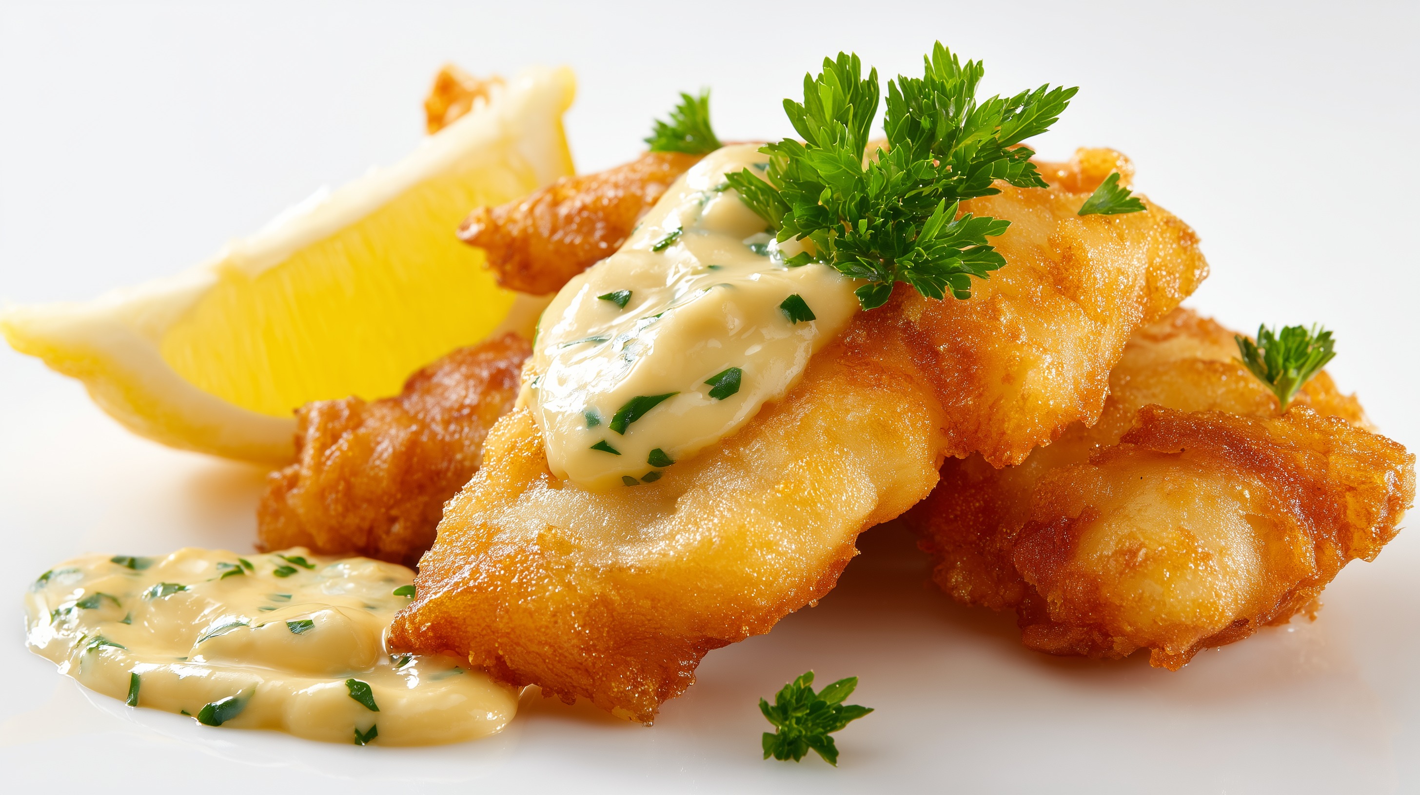 - Fisch frittieren: Die Fischstücke portionsweise durch den Backteig ziehen, leicht abtropfen lassen und vorsichtig ins heiße Öl gleiten lassen. Jede Portion ca. 3–4 Minuten goldbraun und knusprig frittieren. Nicht zu viele Stücke auf einmal ins Öl geben, damit die Temperatur nicht zu stark abfällt.