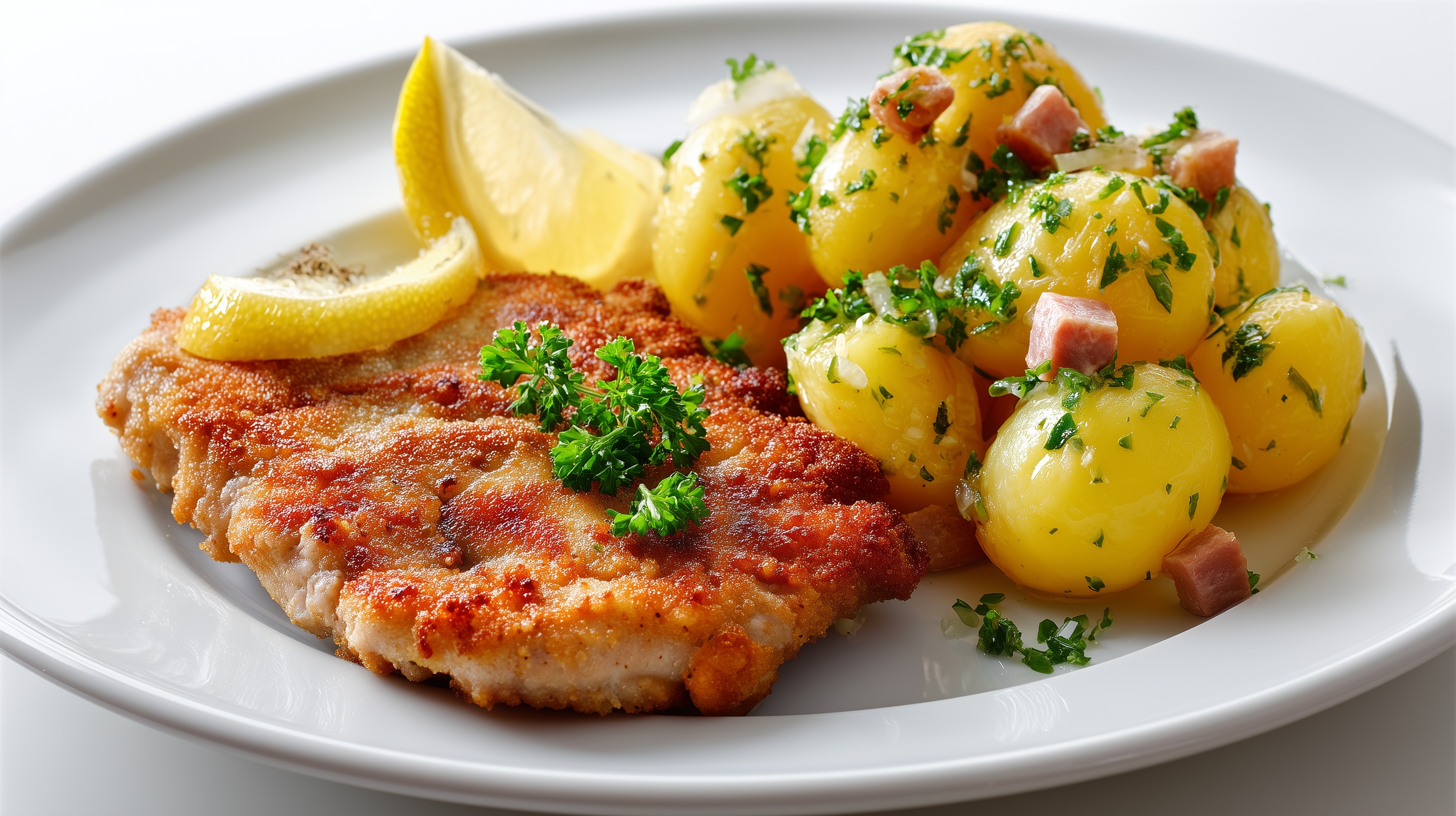 - Die Schnitzel zusammen mit den Bratkartoffeln auf vorgewärmten Tellern anrichten. Mit Zitronenspalten und frischer Petersilie garnieren und sofort servieren.