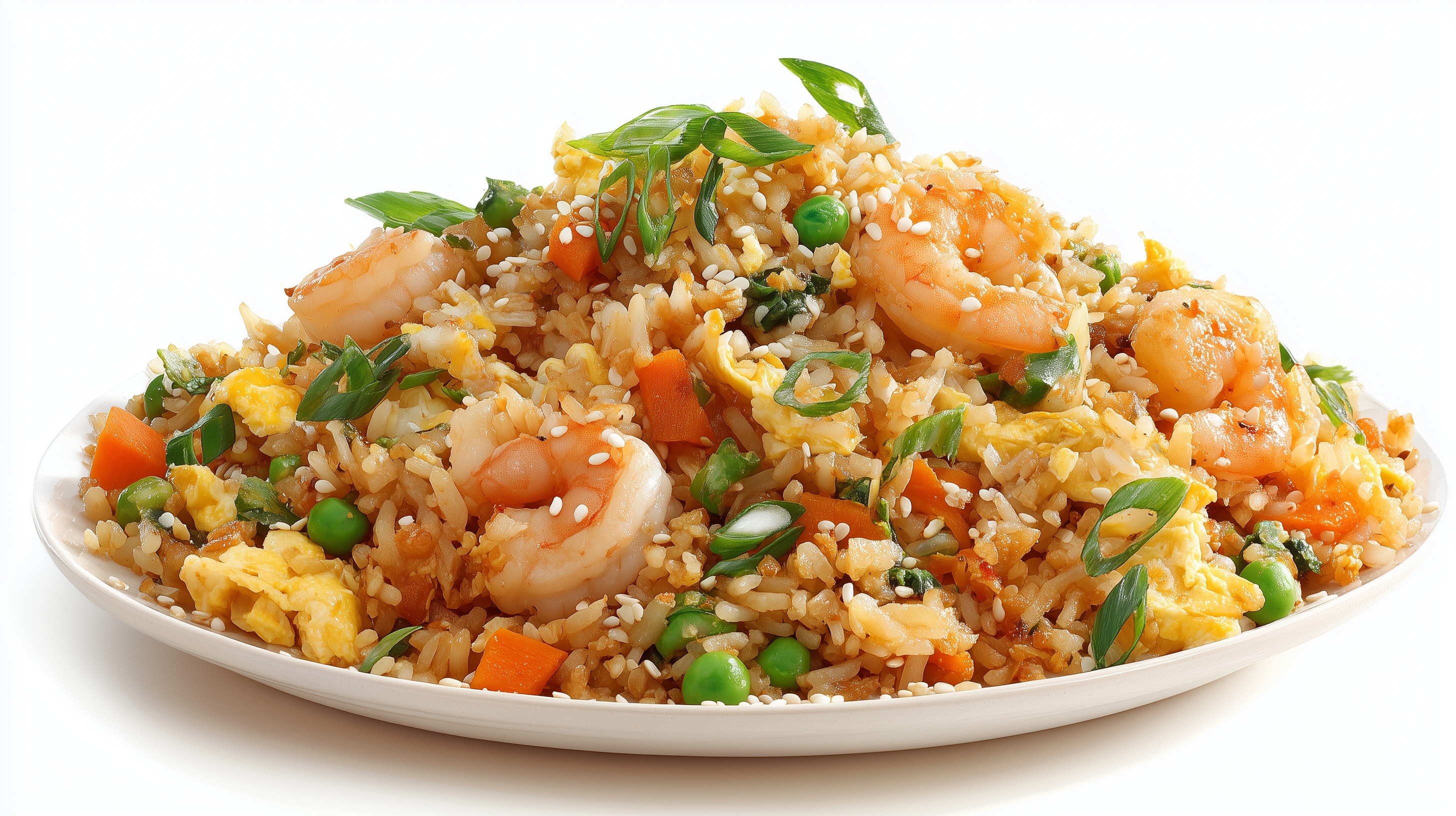 - Zum Schluss das Sesamöl unterrühren. Den gebratenen Reis auf einem weißen Teller anrichten und mit Frühlingszwiebeln und Sesamsamen garnieren.
