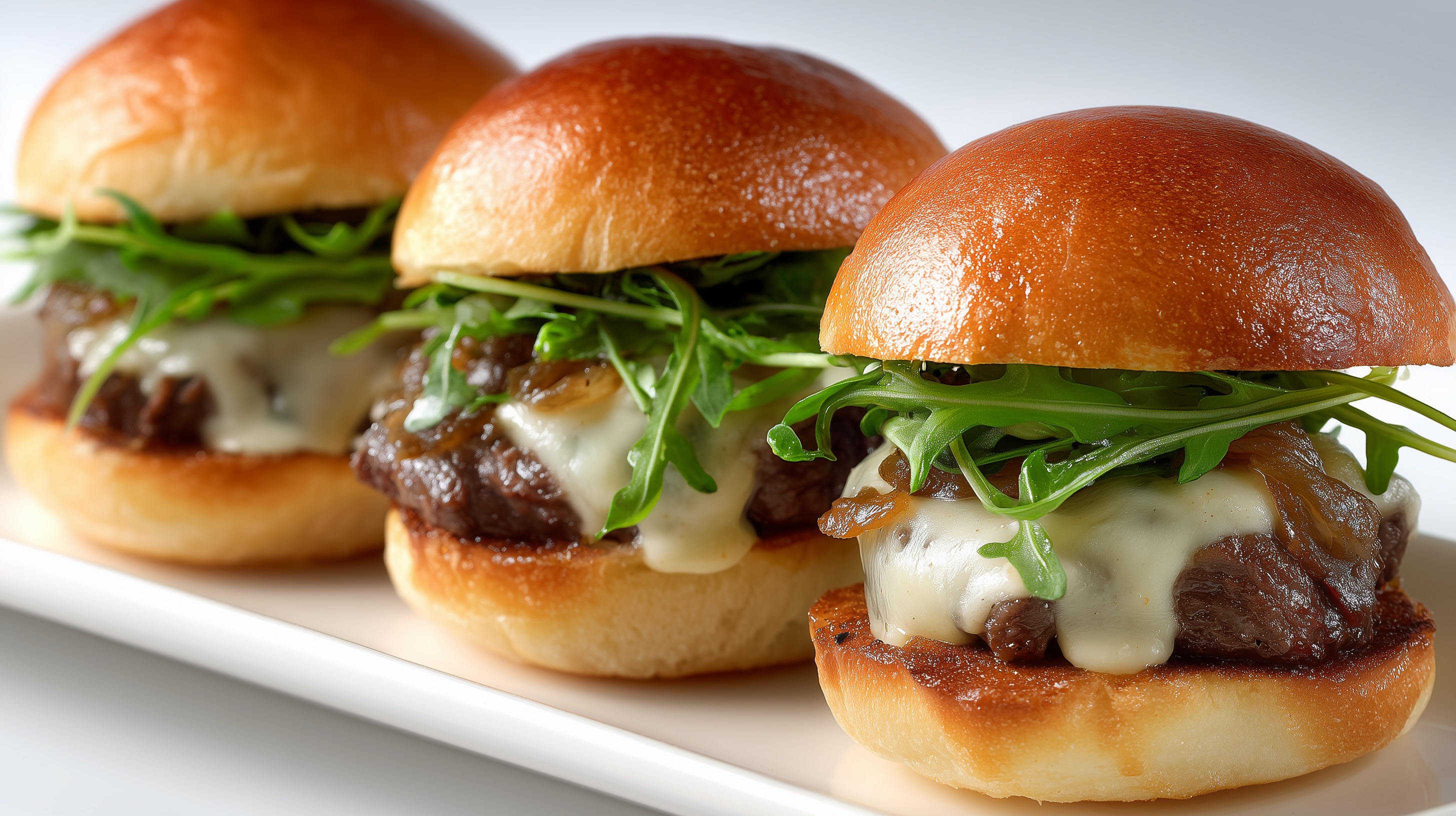 - Slider zusammenbauen: Untere Brötchenhälfte großzügig mit Trüffelmayonnaise bestreichen. Wagyu-Patty mit geschmolzenem Käse darauflegen, karamellisierte Zwiebeln darüber verteilen, eine Handvoll Rucola auflegen und die obere Brötchenhälfte aufsetzen. Sofort servieren.