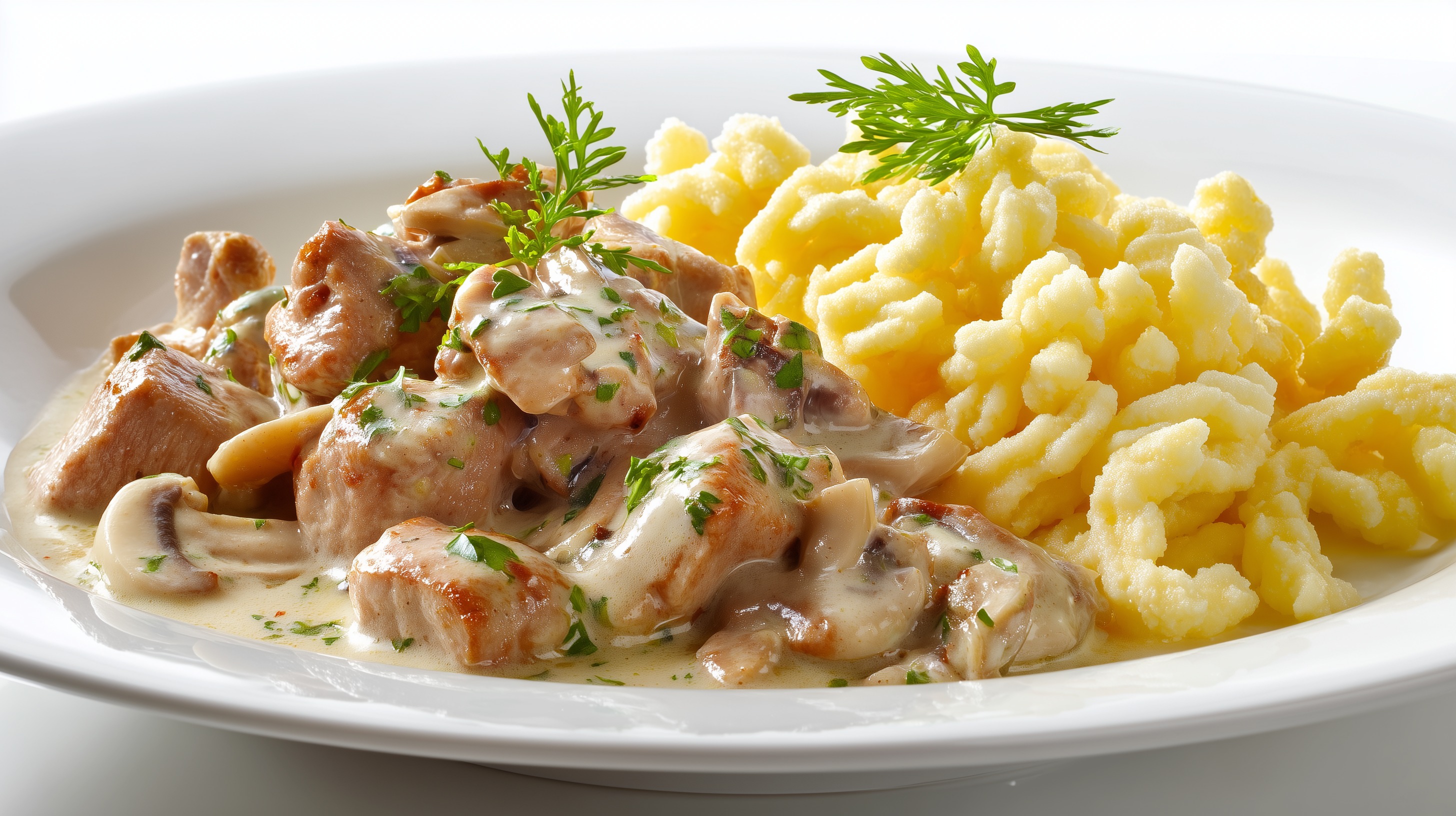 - Anrichten: Spätzle und Geschnetzeltes auf vorgewärmten Tellern anrichten und mit frischer Petersilie garnieren. Sofort servieren.
