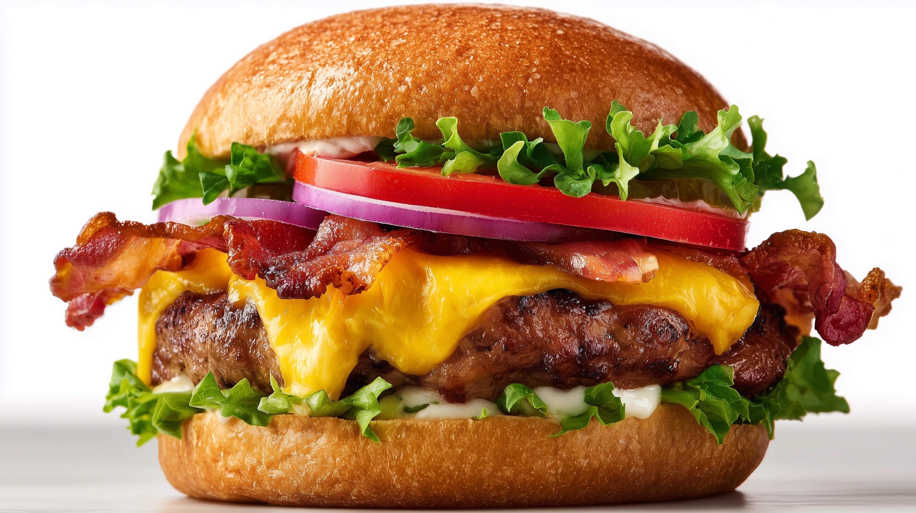 - Burger zusammensetzen: Die untere Brötchenhälfte großzügig mit der Sauce bestreichen, darauf Salat und einen Schuss Sauce geben. Den Patty mit dem geschmolzenen Käse darauflegen, Bacon, rote Zwiebelringe und Tomatenscheiben schichten. Obere Brötchenhälfte ebenfalls mit Sauce bestreichen und aufsetzen.