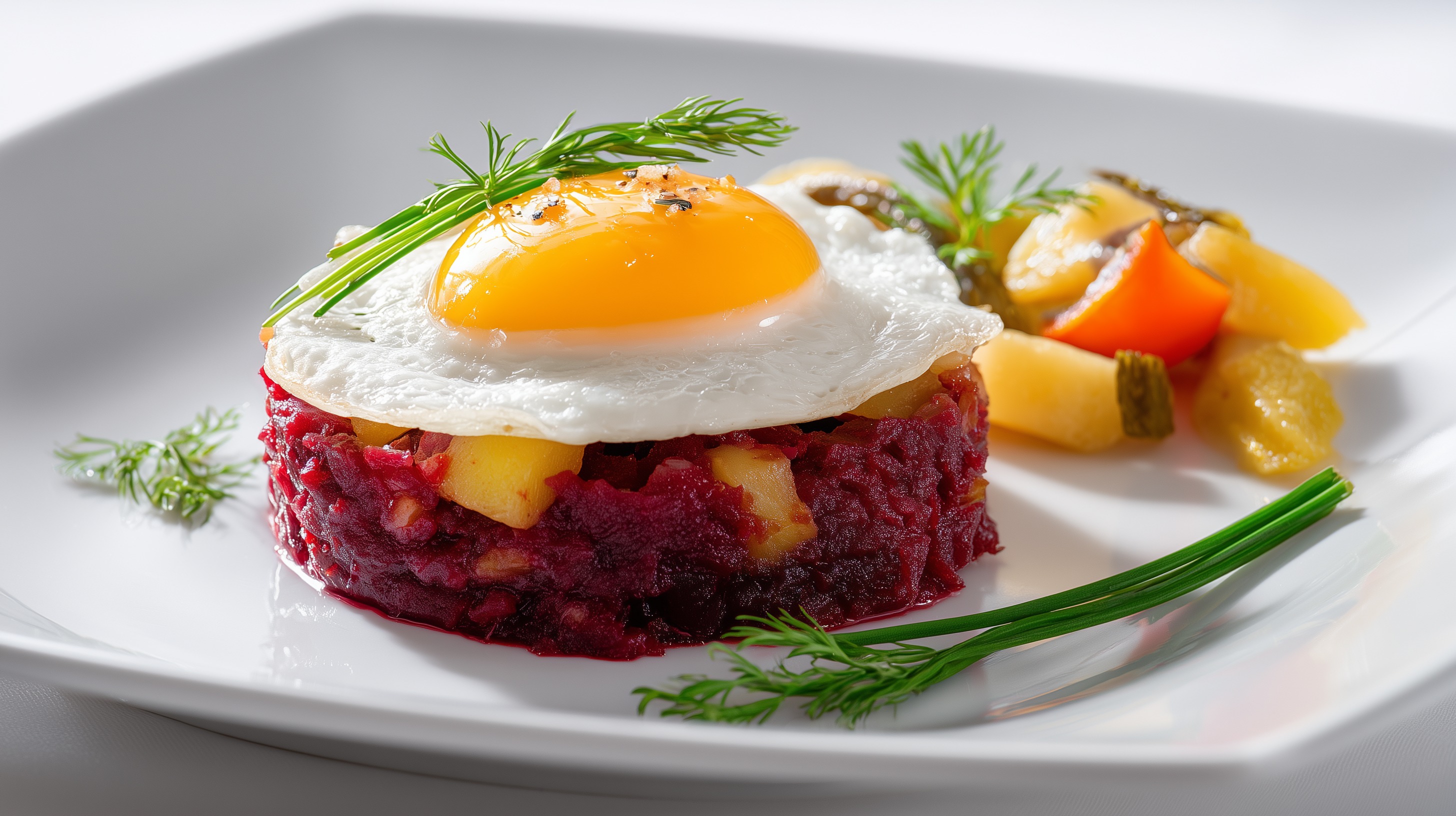 - Je ein Spiegelei oben auf den Labskaus-Turm setzen. Mit frischem Dill und Schnittlauch garnieren. Eingelegte Gurken und Mixed Pickles seitlich anrichten und sofort servieren.