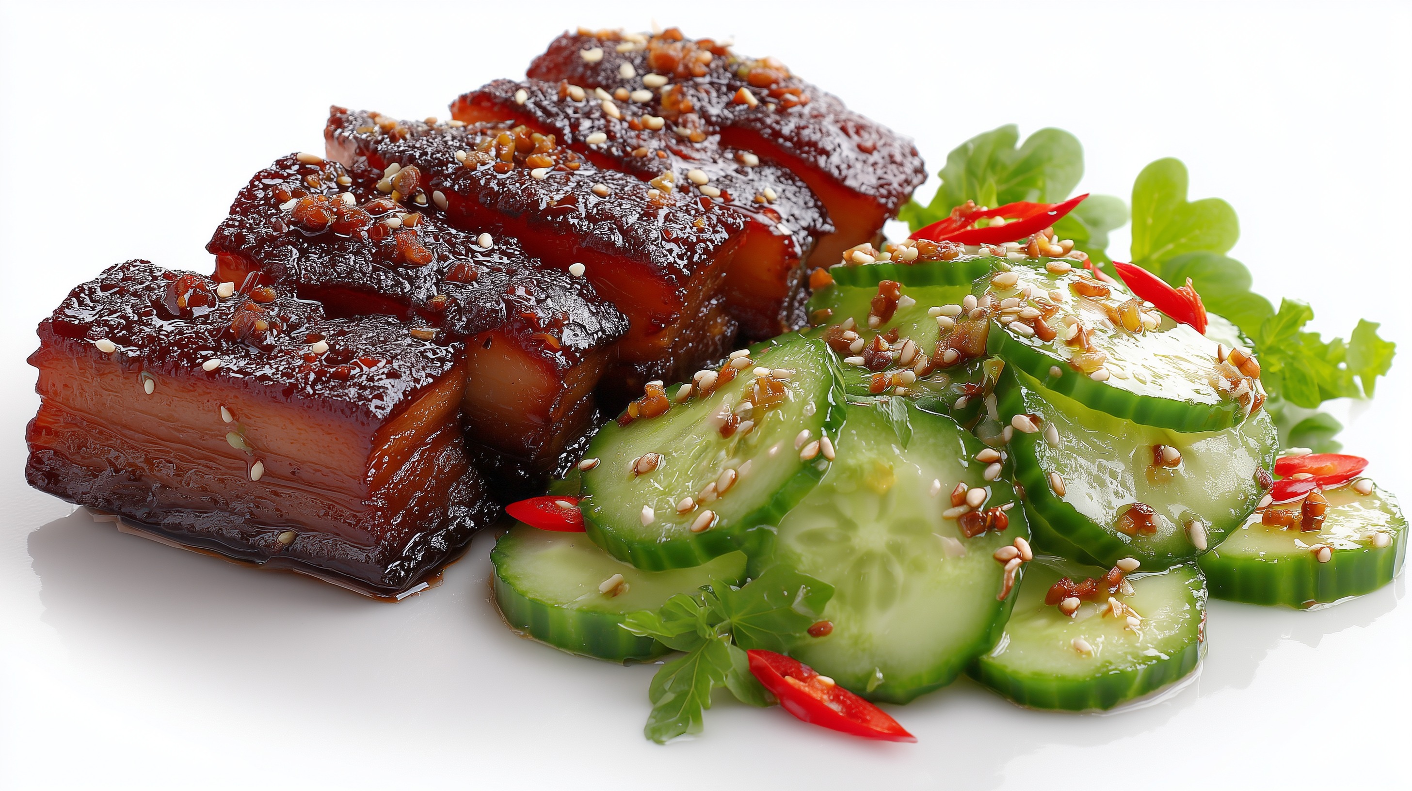 - Den fertig gegarten Schweinebauch aus dem Ofen nehmen und kurz ruhen lassen. Mit Sesamsamen bestreuen, mit dem Gurkensalat anrichten und mit frischen Korianderblättern garnieren. Sofort servieren.