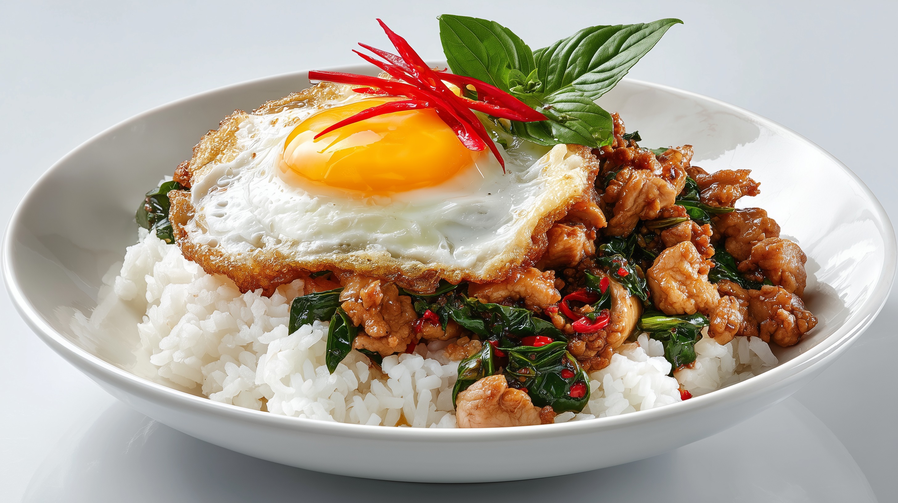 - Reis auf vier tiefe Teller verteilen, das Pad Krapao Gai großzügig darüber geben und je ein Spiegelei obenauf legen. Mit frischen Chilistreifen und Basilikumblättern garnieren und sofort servieren.