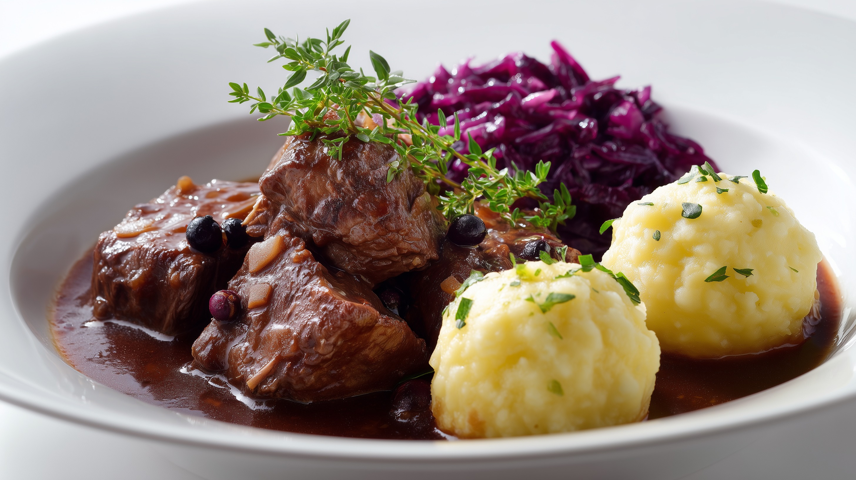 - Anrichten: Je 2 Klöße und eine Portion Rotkohl in tiefen Tellern anrichten, das Ragout mit Sauce dazugeben. Mit frischer Petersilie und einem Thymianzweig garnieren.
