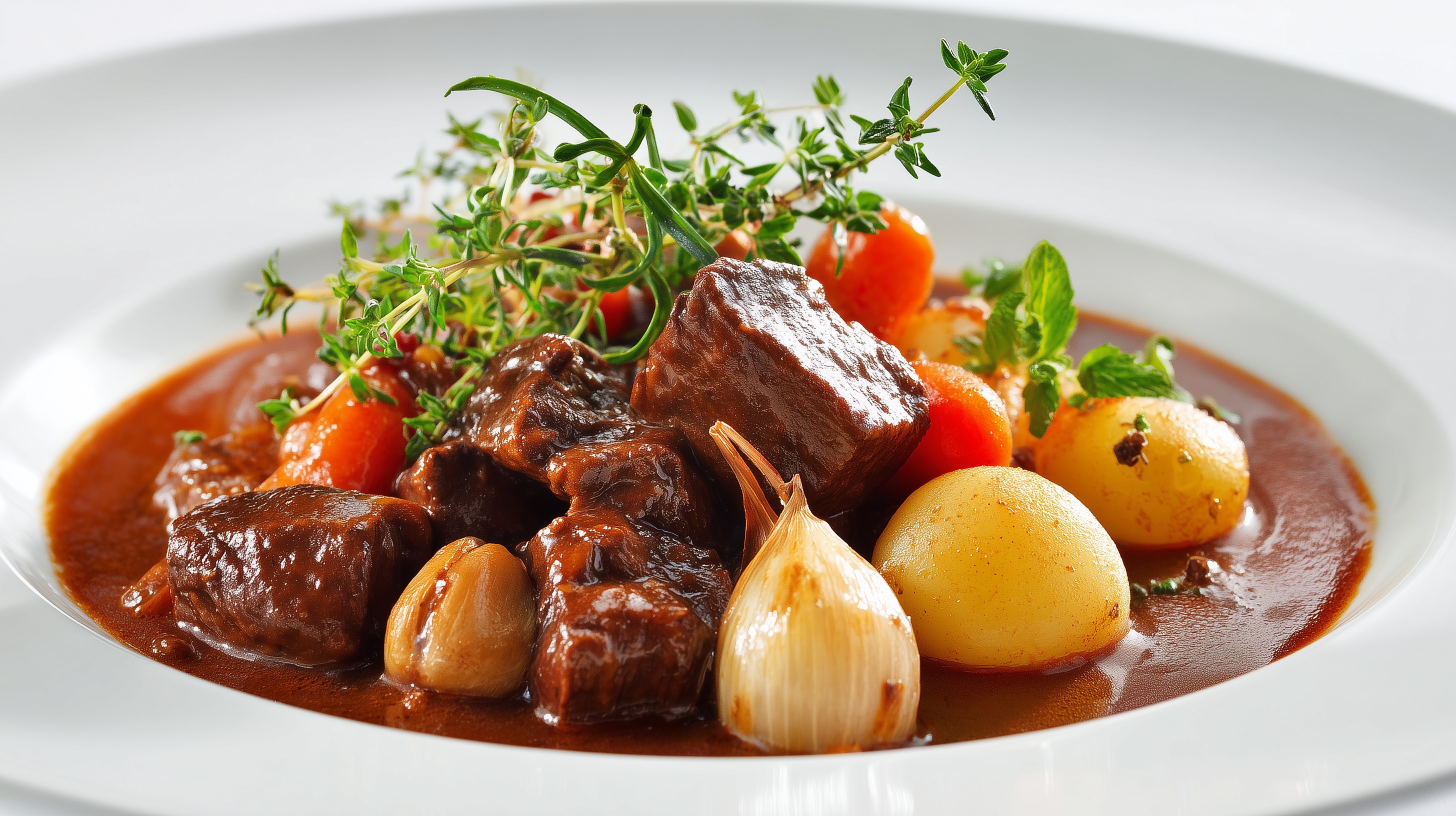 - Die Lorbeerblätter entfernen, Sauce abschmecken und nach Bedarf nachwürzen. Mit frischem Thymian und Petersilie garniert servieren.