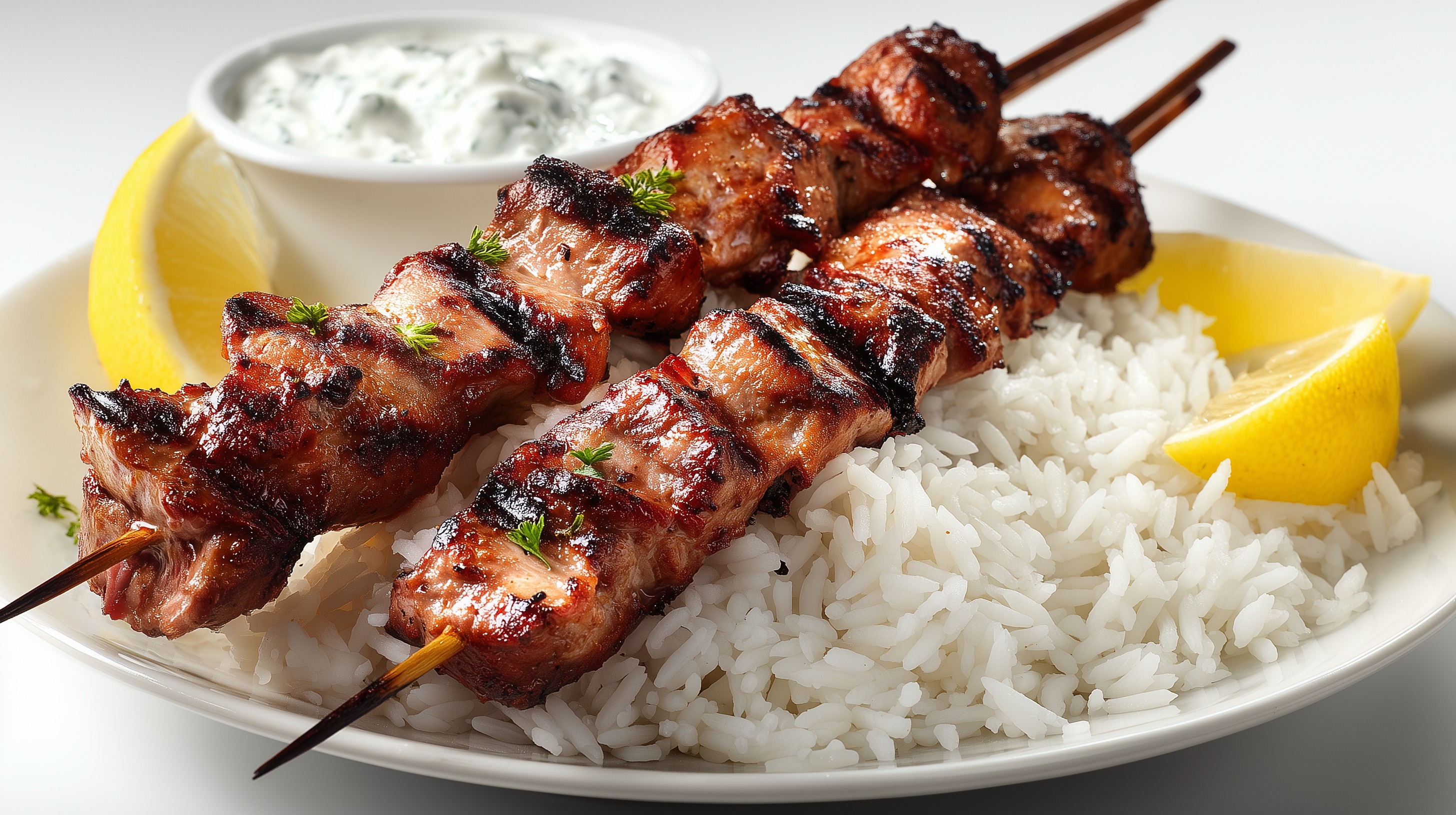 - Anrichten: Reis auf Teller verteilen, je 2 Spieße darauflegen, Tzatziki in einer kleinen Schale dazu servieren und mit Zitronenspalten sowie frischen Kräutern garnieren.