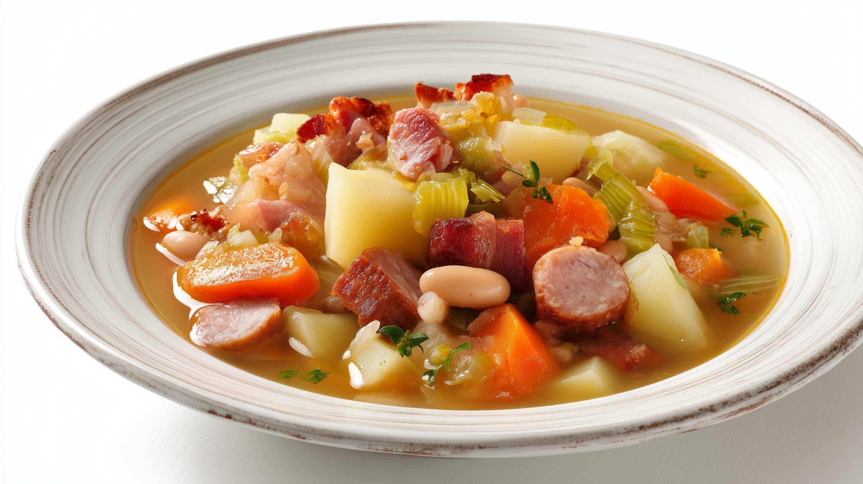 - Die Bohnen und Wurstscheiben in den Topf geben und weitere 10 Minuten köcheln lassen, bis Kartoffeln und Möhren weich sind.