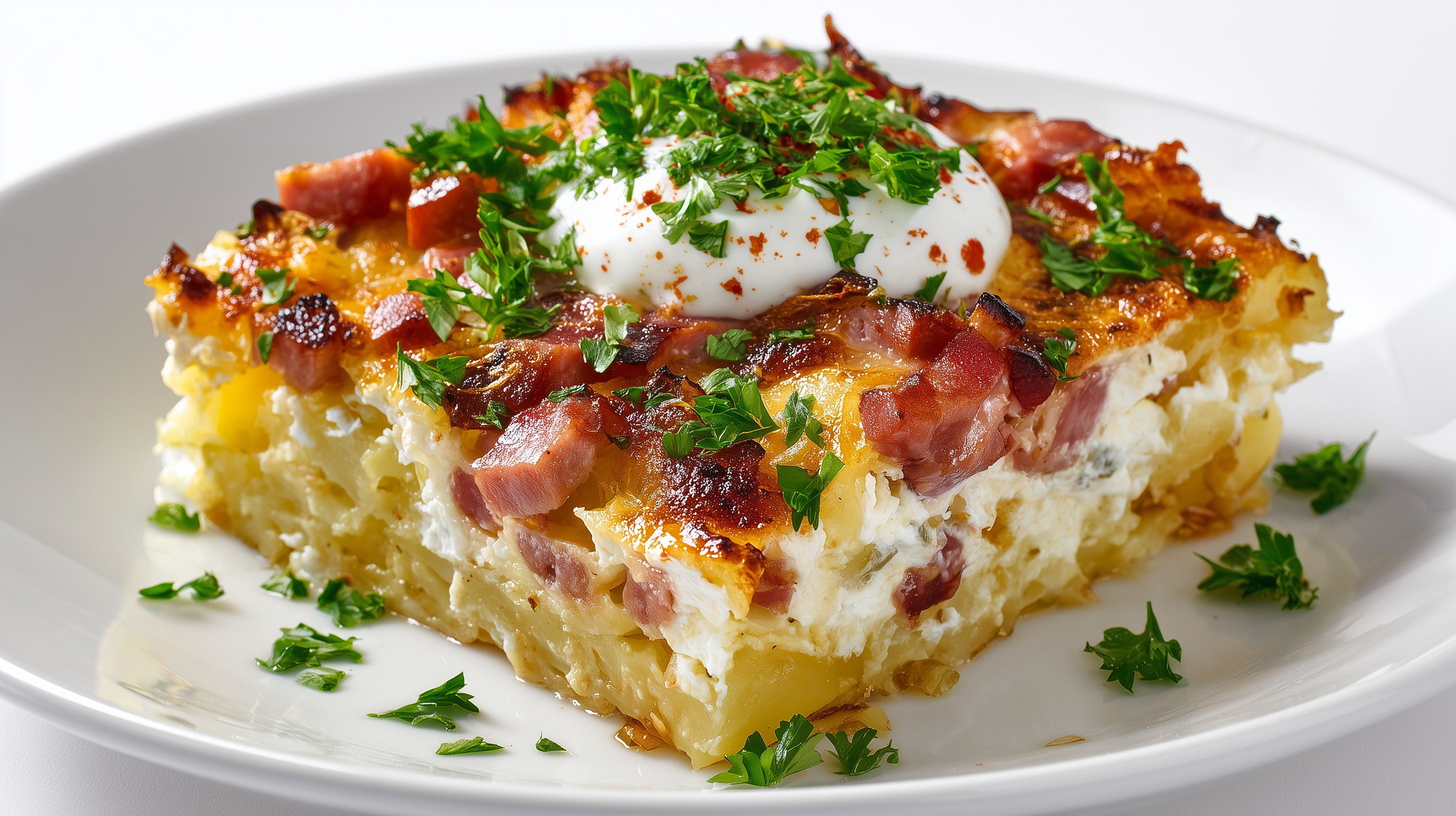 - Den Auflauf aus dem Ofen nehmen, kurz ruhen lassen und mit frischer Petersilie sowie einem Klecks Sauerrahm garniert servieren.