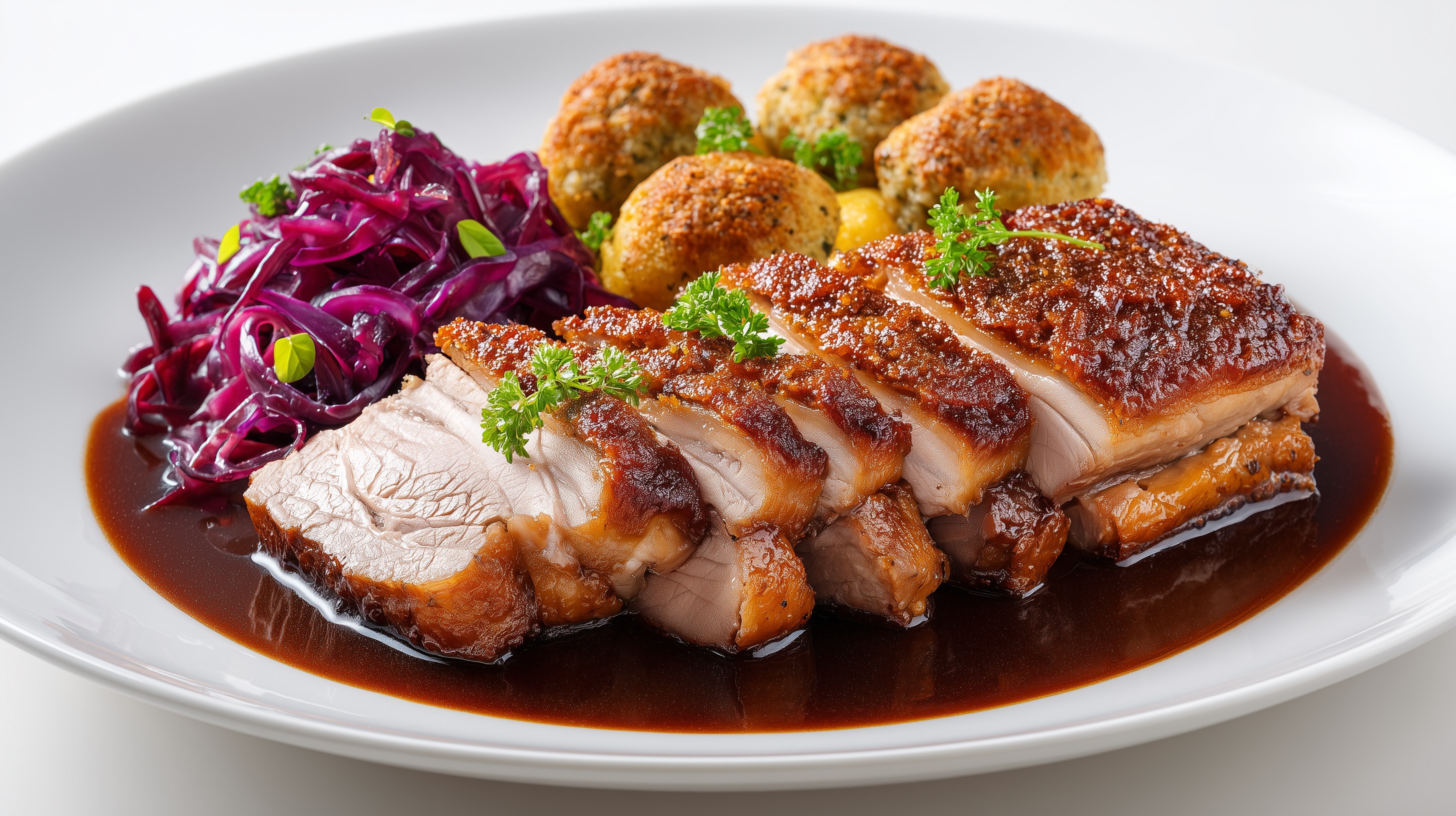 - Anrichten: Den Krustenbraten in dicke Scheiben schneiden und auf vorgewärmten Tellern mit je 2 Knödeln und reichlich Rotkohl anrichten. Mit der Soße großzügig übergießen und mit frischer Petersilie garnieren.