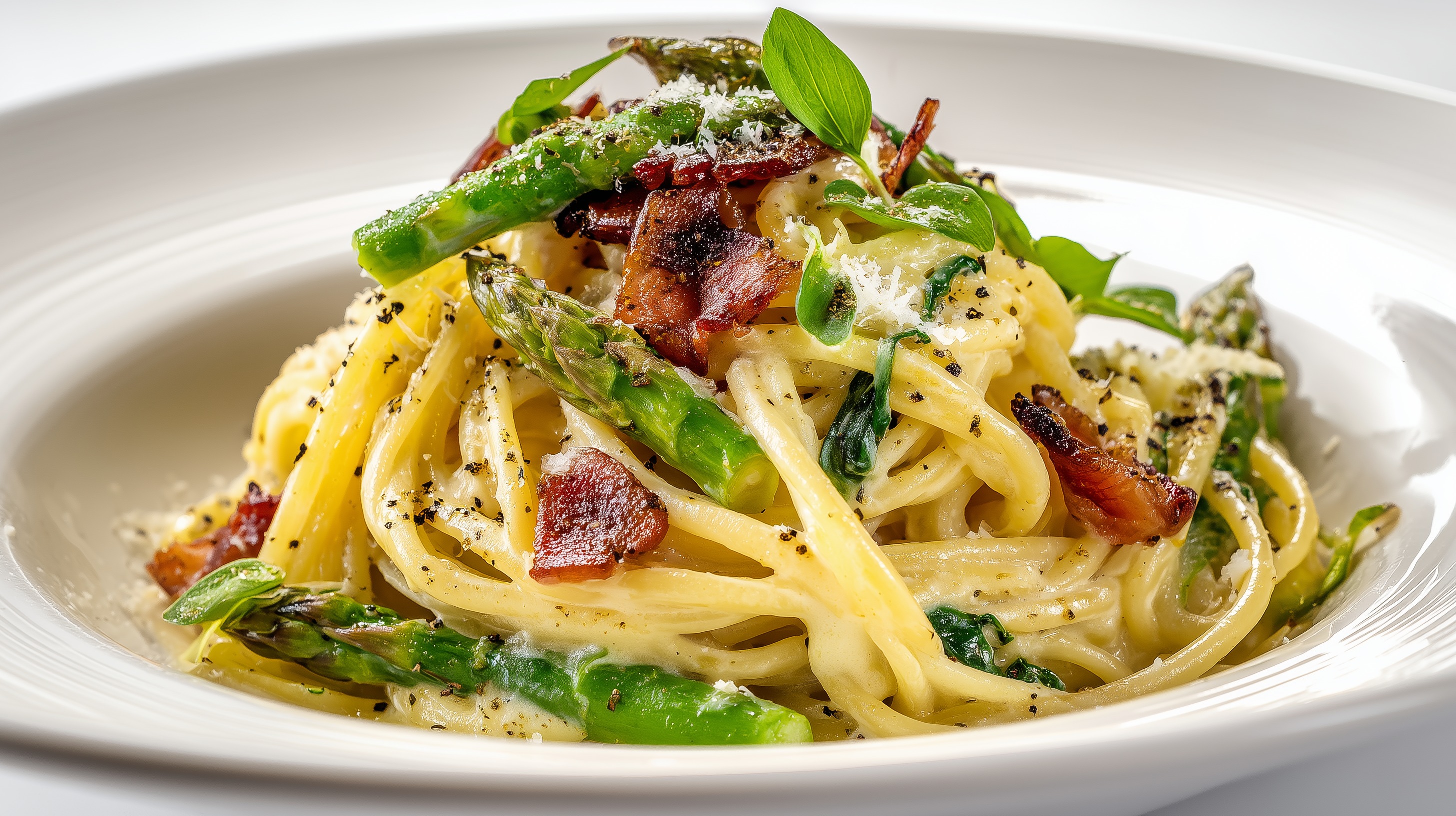 Tipp: Der wichtigste Schritt bei einer Carbonara ist das Abseits-vom-Herd-Rühren – nur so wird die Sauce cremig und die Eier stocken nicht. Wer keinen frischen Bärlauch bekommt, kann ihn durch 2 EL Bärlauchpesto ersetzen oder frische Petersilie verwenden. Grüner Spargel muss im Gegensatz zu weißem Spargel nicht geschält werden.