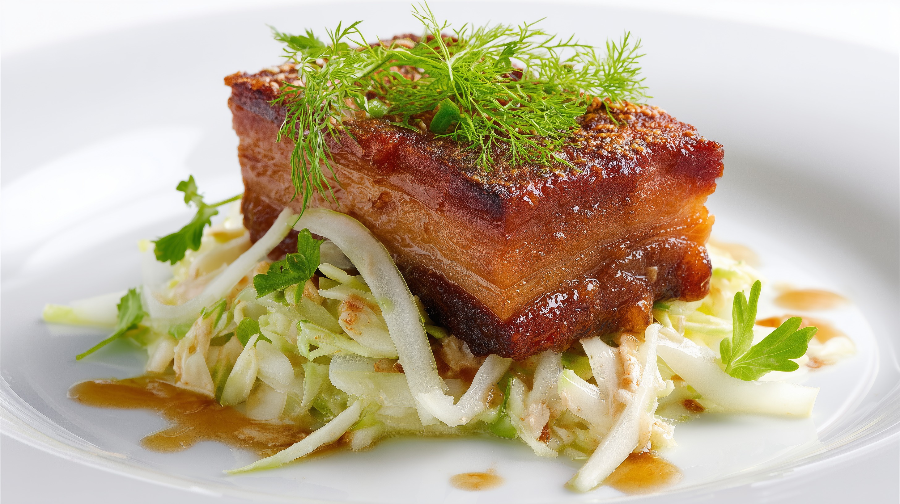 - Anrichten: Den Apfel-Slaw mittig auf einen weißen Teller geben. Ein Stück Schweinebauch daraufsetzen. Etwas Sauce um den Slaw träufeln. Mit frischem Dillgrün und Petersilienblättern garnieren und sofort servieren.