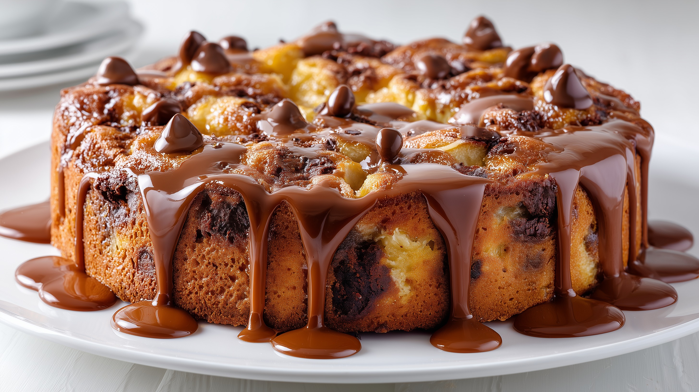 - Die Schokoladenglasur großzügig über den ausgekühlten Kuchen gießen und die Seiten herunterlaufen lassen. Nach Belieben mit weiteren Schokoladentropfen dekorieren. Vor dem Anschneiden ca. 15 Minuten fest werden lassen.