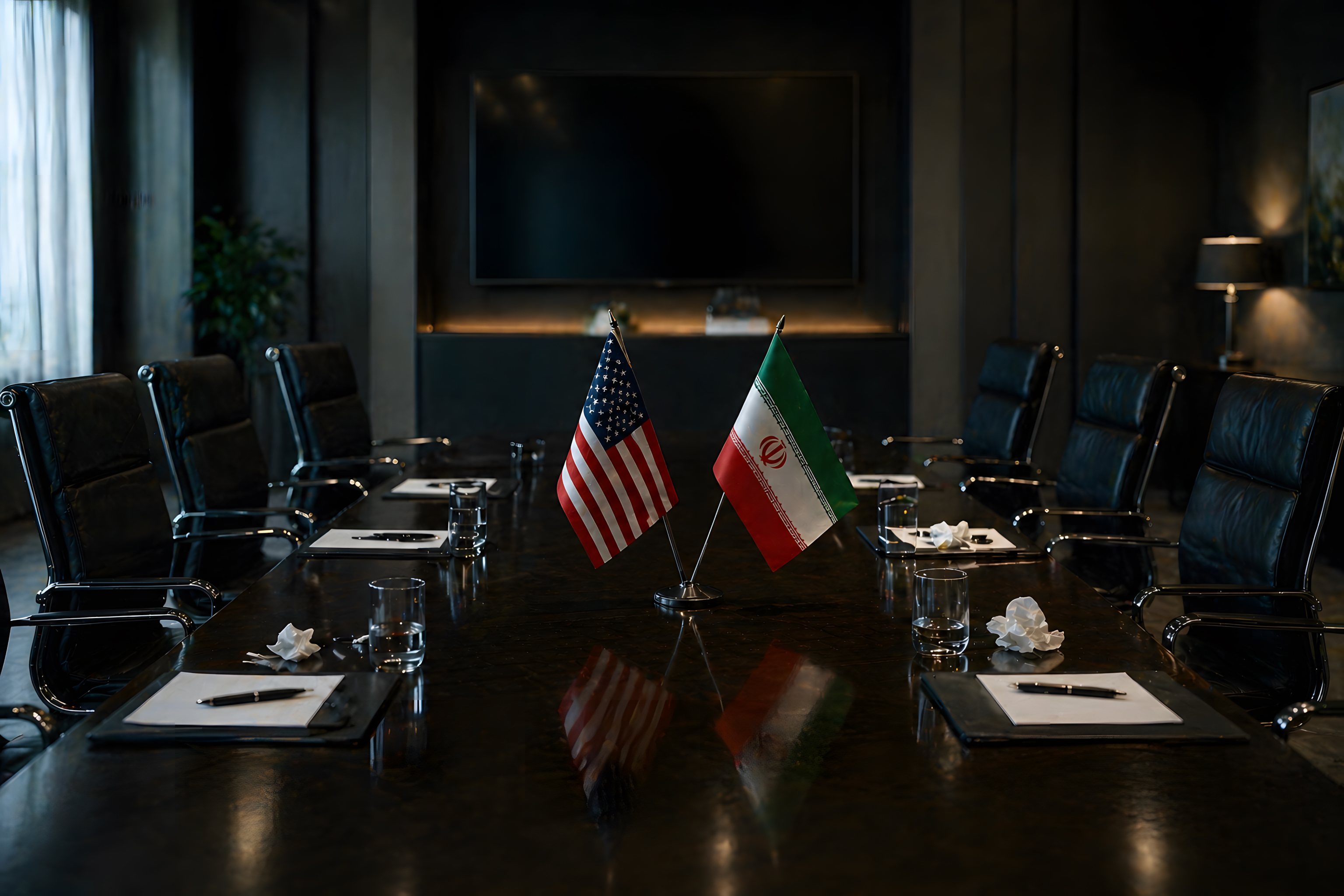 Das Foto zeigt einen leeren, dunklen Konferenztisch aus hochglanzpoliertem Holz, auf dem zwei kleine Tischflaggen der USA und des Iran nebeneinander aufgestellt sind. Die amerikanische Flagge mit ihren roten, weißen und blauen Streifen steht der grün-weiß-roten iranischen Flagge mit dem Staatsemblem gegenüber. Auf dem Tisch liegen aufgeklappte Schreibmappen mit weißen Blättern und Kugelschreibern sowie Wassergläser und gefaltete Taschentücher.