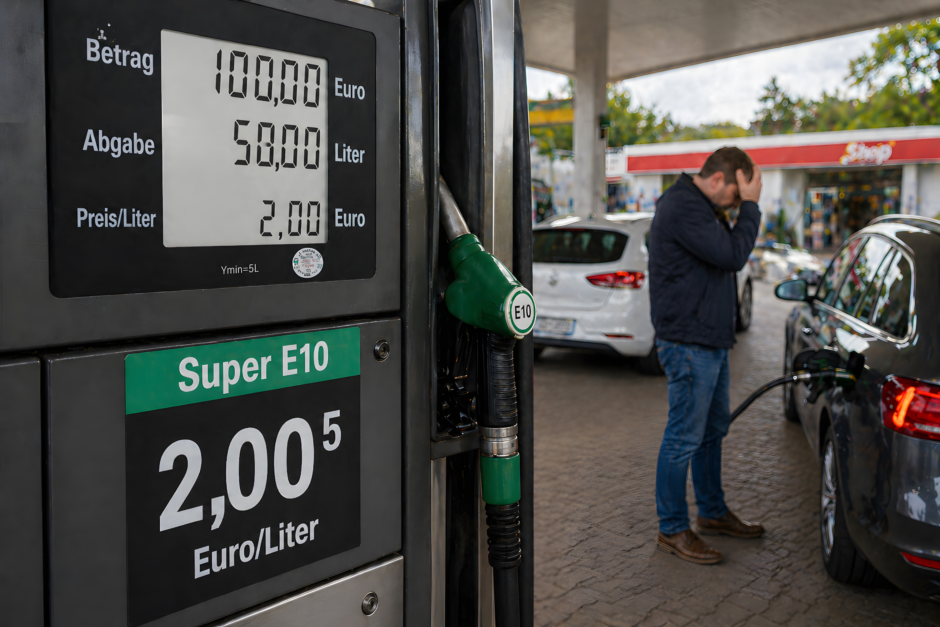 Im Hintergrund ist ein Mann in blauer Jacke und Jeans zu sehen, der sich mit der Hand an den Kopf fasst — eine Geste, die Frustration oder Schock über die hohen Kraftstoffpreise ausdrückt. Neben ihm steht ein dunkles Fahrzeug mit geöffnetem Tankdeckel.