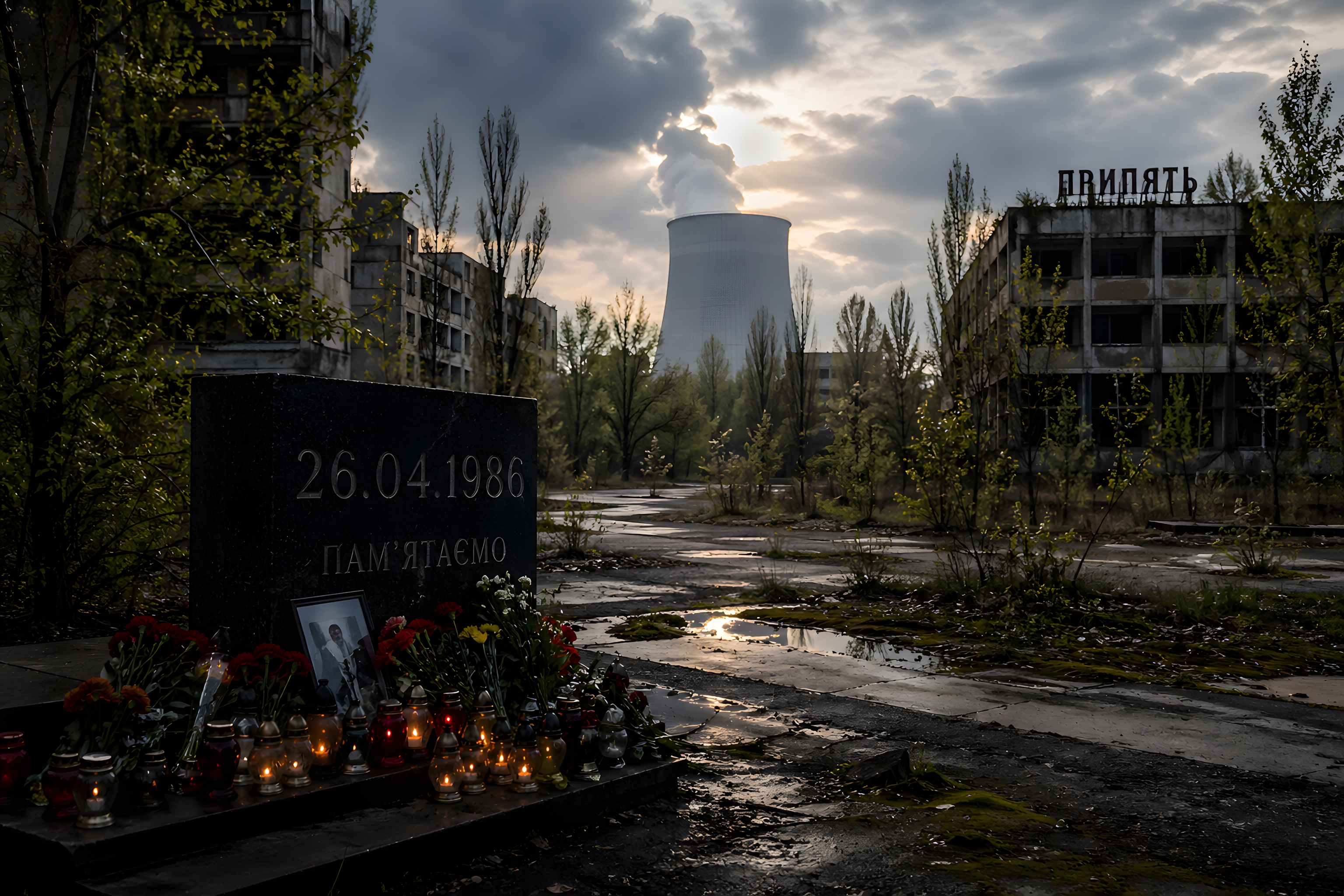 Dieses eindrucksvolle Foto zeigt die Gedenkstätte im Stadtzentrum von Prypjat in der Ukraine. Im Vordergrund steht ein schwarzer Granitgedenkstein mit der Aufschrift «26.04.1986» und dem ukrainischen Wort für «Wir erinnern uns». Davor sind Kerzen, Blumen und ein gerahmtes Foto als stille Ehrerbietung arrangiert.