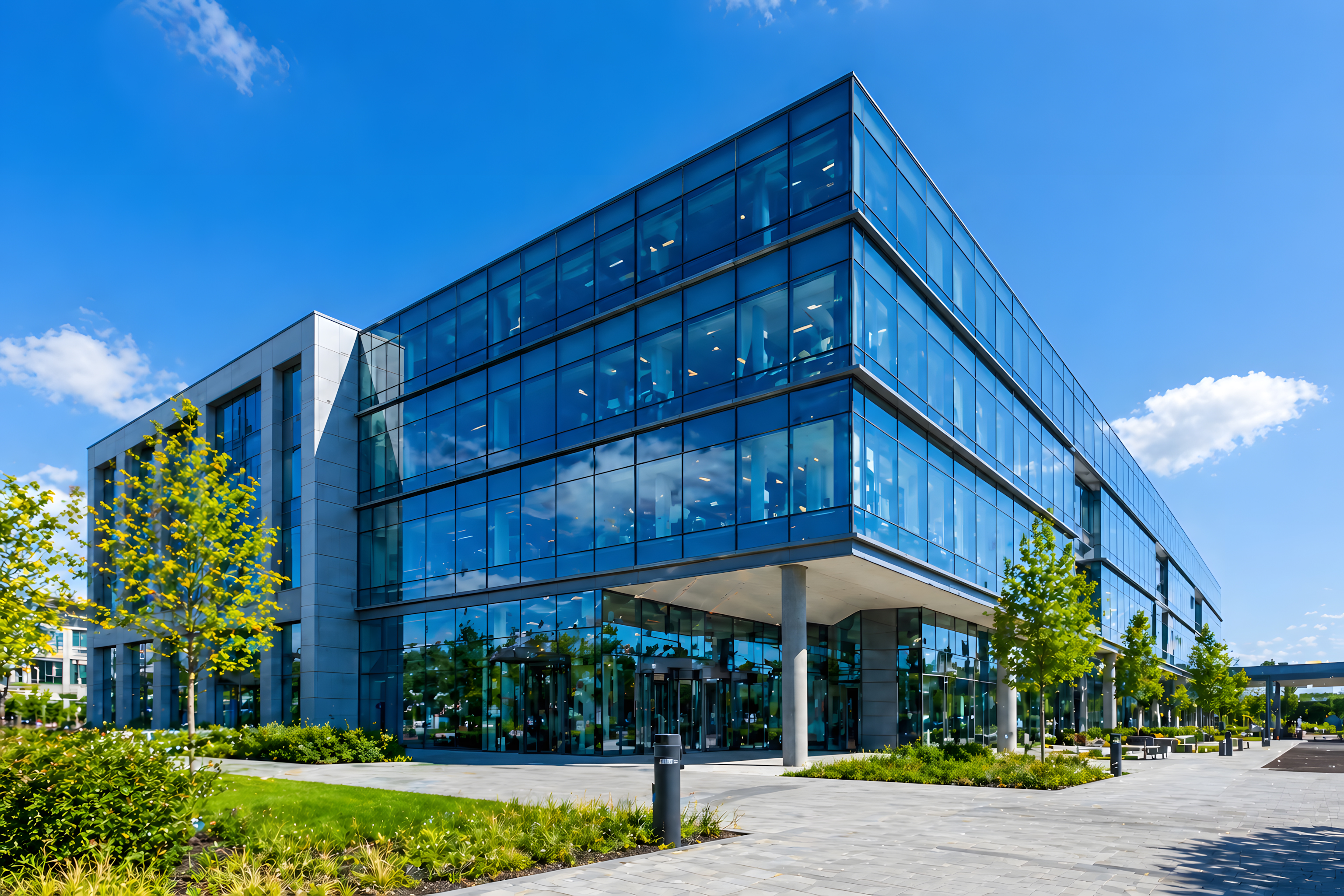 Dieses professionelle Architekturfoto zeigt ein modernes Bürogebäude mit einer weitläufigen, blauen Glasfassade, die im Sonnenlicht glänzt. Das mehrstöckige Gebäude besticht durch seine klare, geometrische Formensprache mit Vorhangfassade aus Stahl und Glas. Der Eingangsbereich im Erdgeschoss wird von mächtigen Betonpfeilern gestützt, während Spiegelungen des blauen Himmels und der Umgebung die Glasflächen beleben.