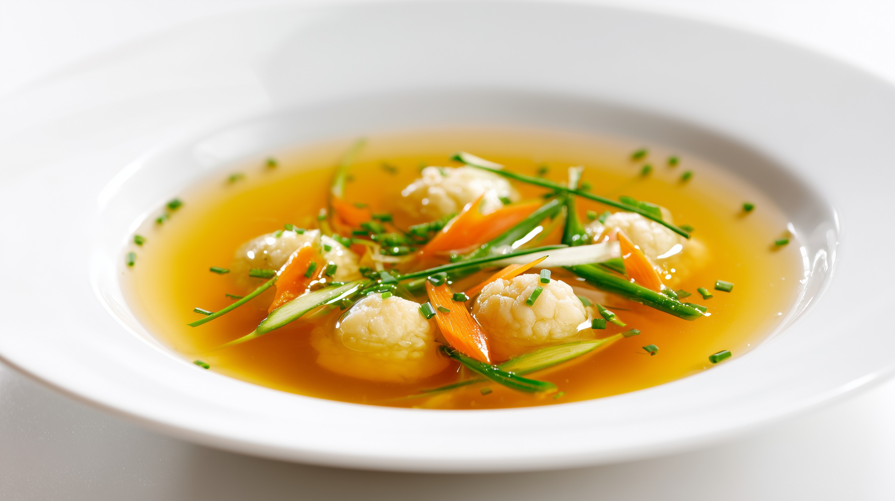 - Die klare Rindsbrühe in vorgewärmte tiefe Teller füllen. Je 3–4 Markklößchen sowie etwas Möhren- und Zucchini-Julienne in die Teller geben. Mit Schnittlauchröllchen bestreuen und sofort servieren.