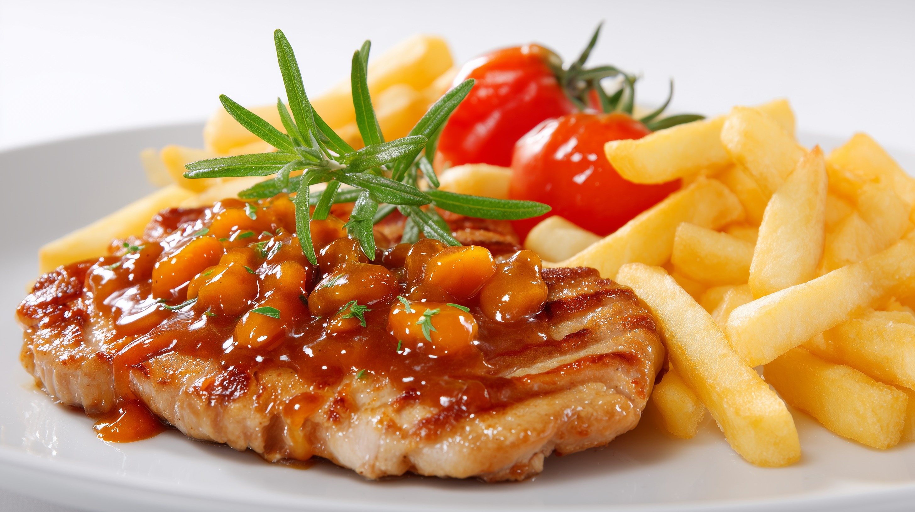 - Schnitzel mit der Curry-Tomatensauce auf Tellern anrichten, Pommes dazulegen und mit frischem Rosmarin und Kirschtomaten garnieren.