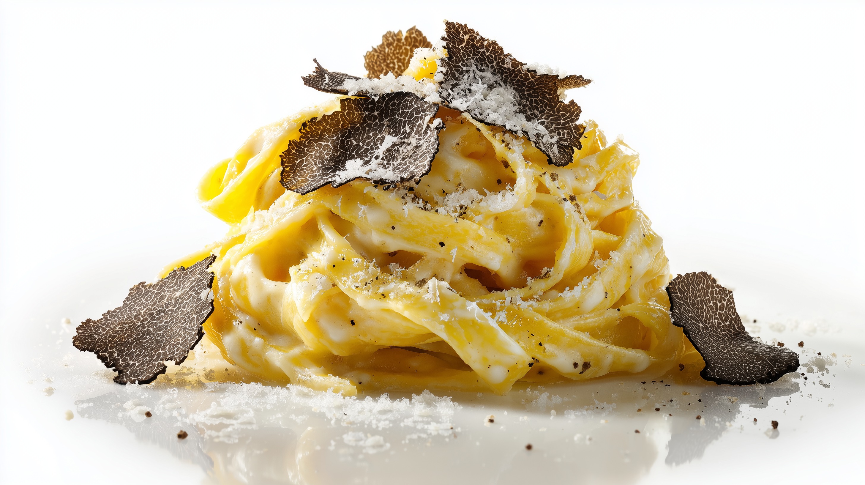 - Pasta sofort auf vorgewärmten Tellern anrichten, großzügig mit frisch gehobeltem Trüffel und zusätzlich geriebenem Parmesan garnieren. Mit etwas schwarzem Pfeffer vollenden und sofort servieren.