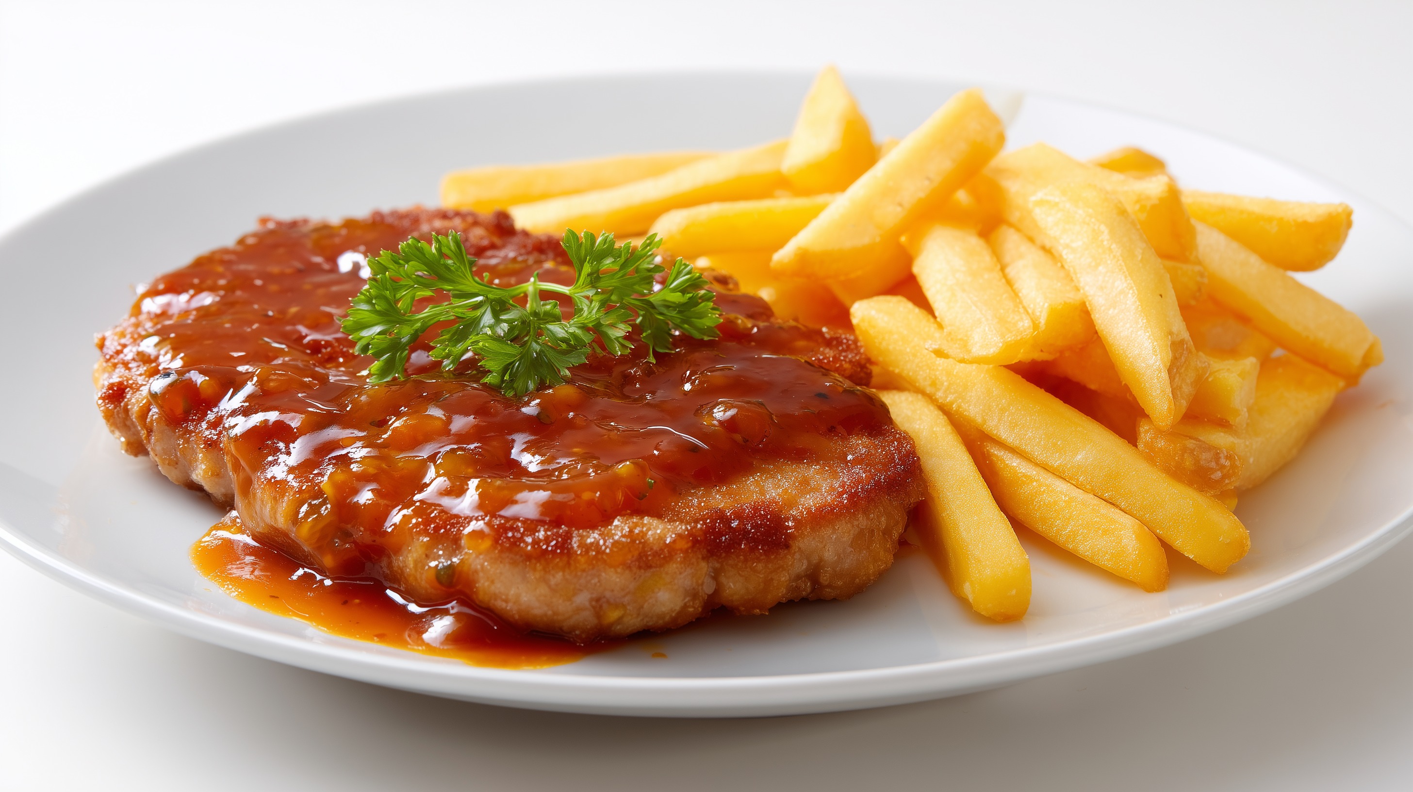 - Die Schnitzel mit reichlich Curry-Tomatensauce auf vorgewärmten Tellern anrichten, die Pommes danebenlegen und mit frischer Petersilie garnieren. Sofort servieren.