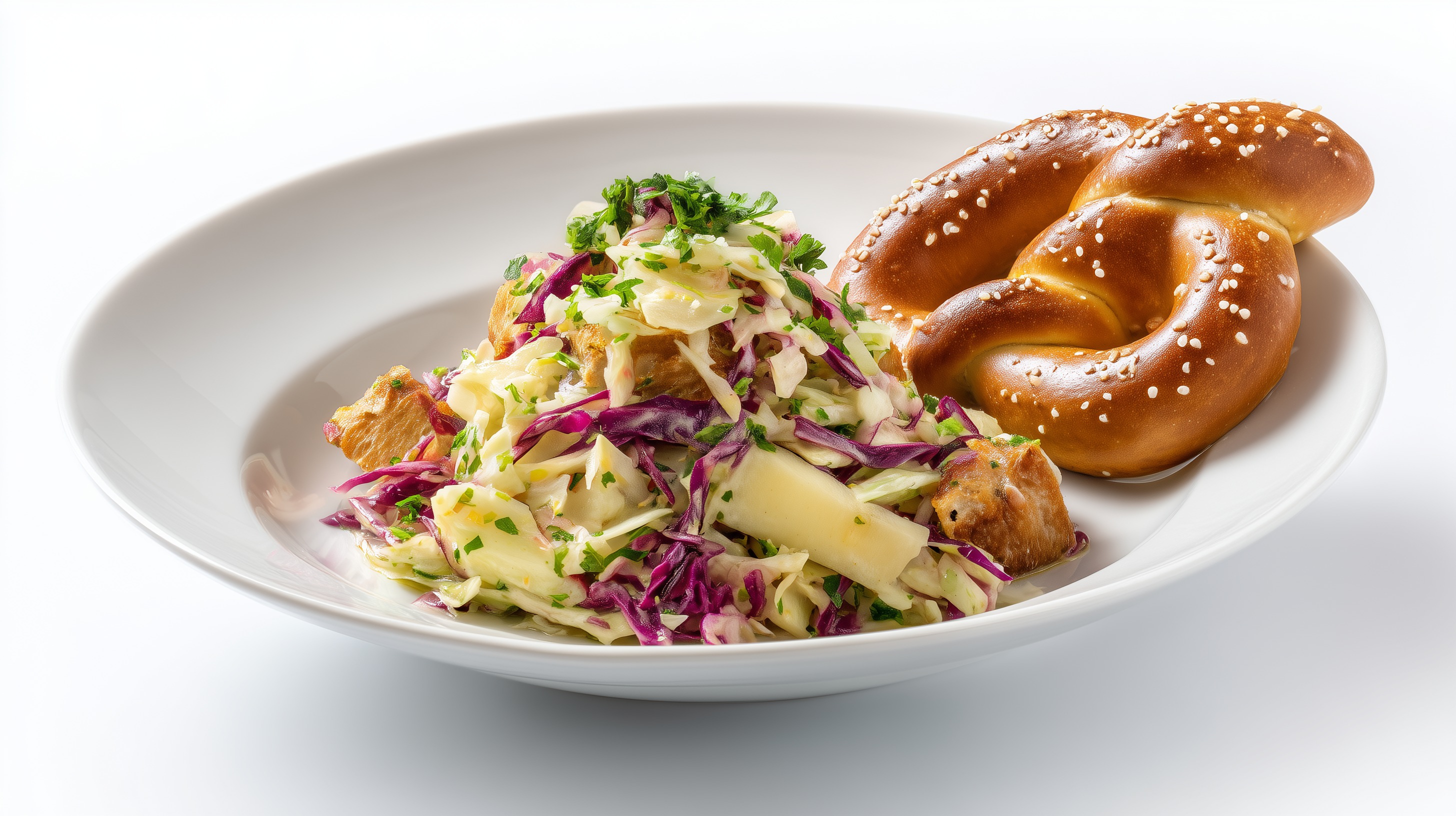 - Den Krautsalat auf tiefen Tellern anrichten und jeweils eine Laugenbrezel daneben platzieren. Mit etwas frischer Petersilie garnieren und sofort servieren.