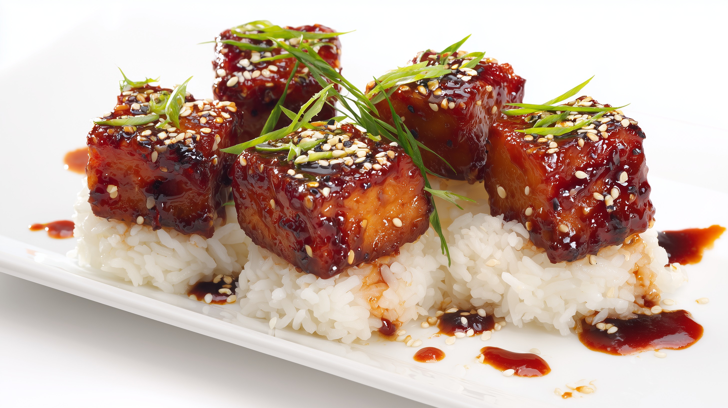 - Den warmen Sushi-Reis mit einer feuchten Hand oder einem Ring zu kompakten Rechtecken oder Quadraten formen und auf einem weißen Teller anrichten. Die glasierten Tofuwürfel daraufsetzen.