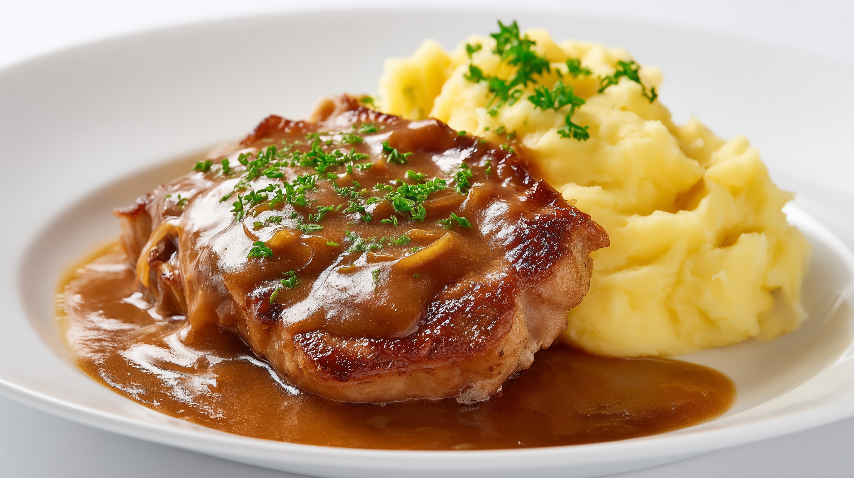 - Schnitzel mit Soße auf vorgewärmten Tellern anrichten, Kartoffelpüree daneben geben und mit frischer Petersilie oder Schnittlauch garnieren. Sofort servieren.
