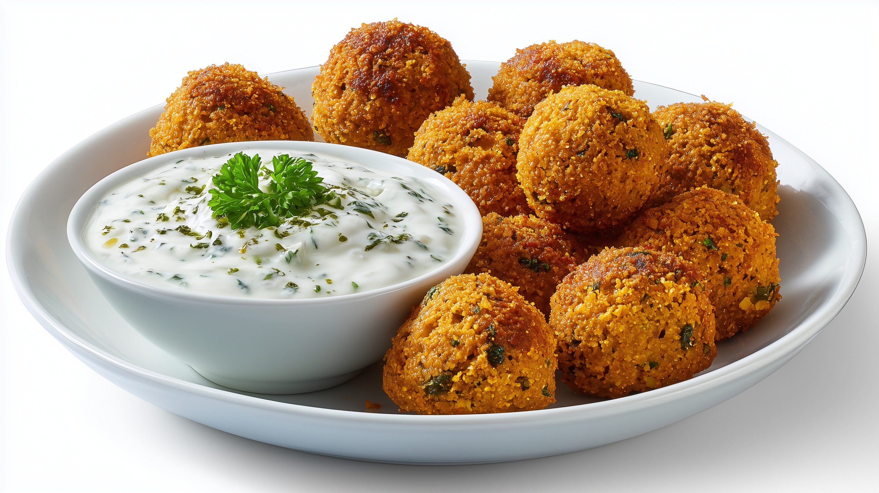 - Falafel auf einem weißen Teller anrichten, den Joghurt-Dip in einer kleinen Schüssel danebenstellen und mit frischer Petersilie garnieren. Sofort servieren.