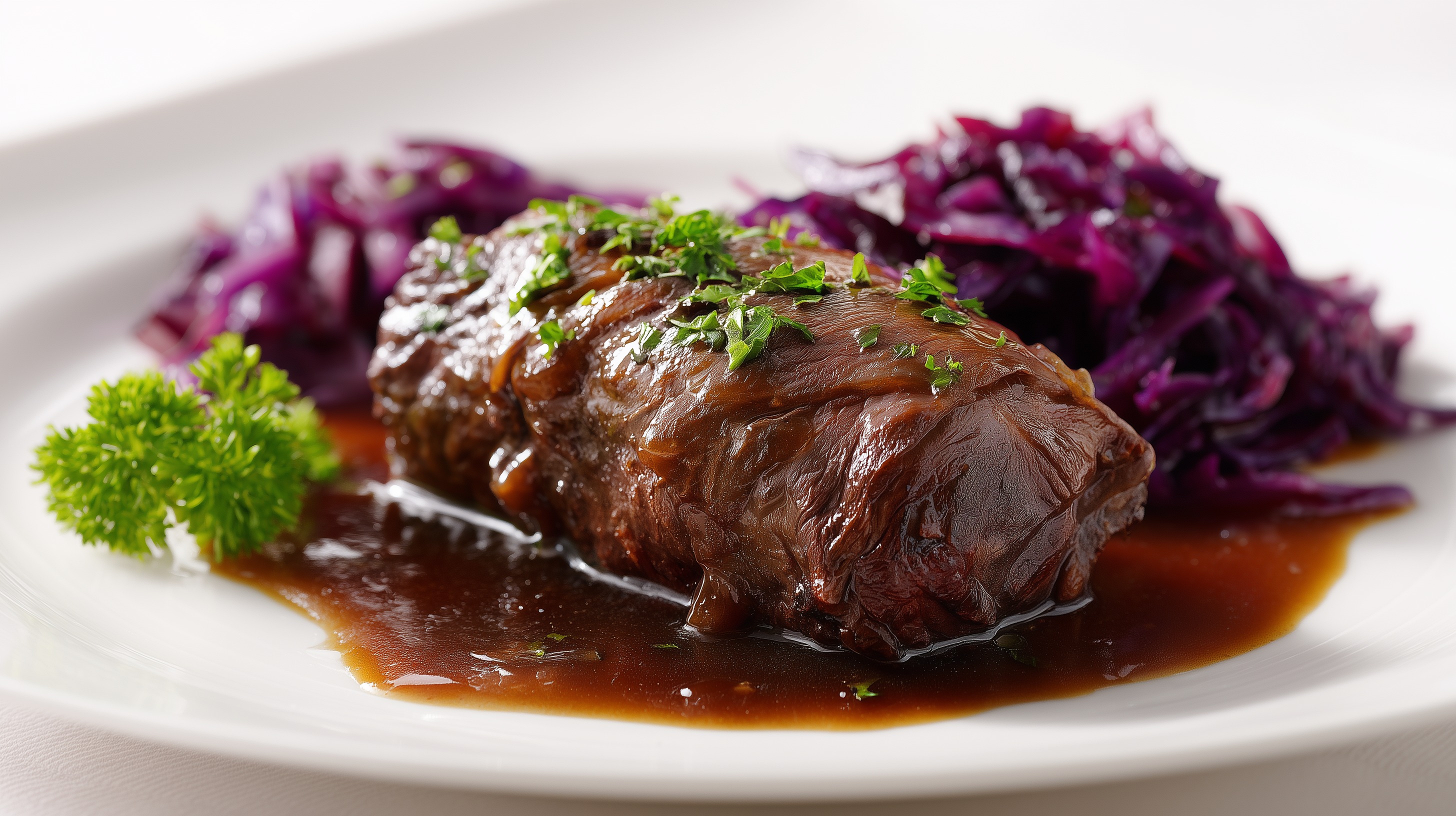 - Servieren: Küchengarn oder Rouladennadeln entfernen. Rouladen mit der Soße und dem Rotkohl auf vorgewärmten Tellern anrichten. Nach Wunsch mit frischer Petersilie garnieren. Als Beilage passen Kartoffelklöße oder Salzkartoffeln.