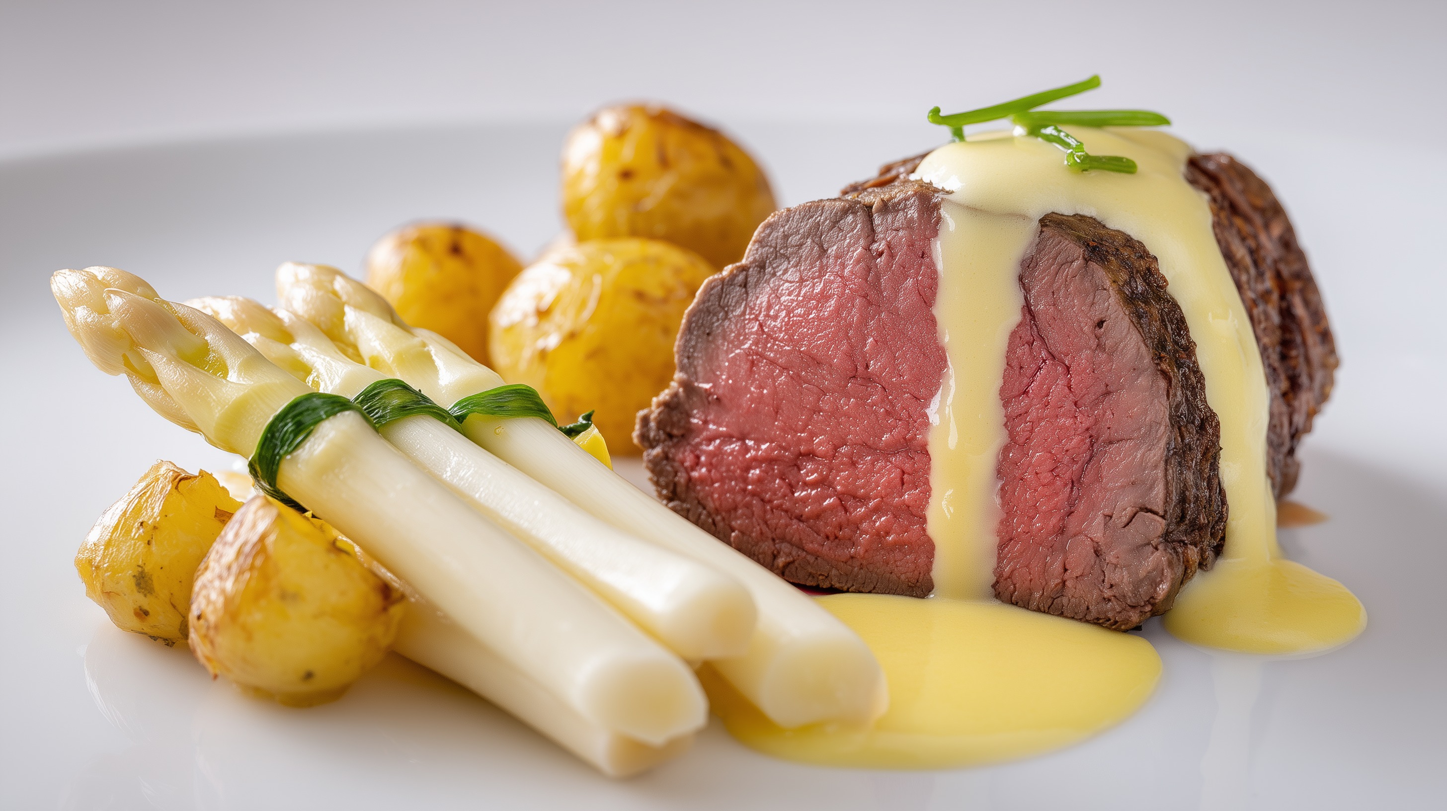 - Anrichten: Das Chateaubriand in der Mitte aufschneiden und auf vorgewärmten Tellern anrichten. Spargel und Drillinge dazu arrangieren, die Béarnaise großzügig über das Fleisch gießen und mit frischem Schnittlauch garnieren. Sofort servieren.