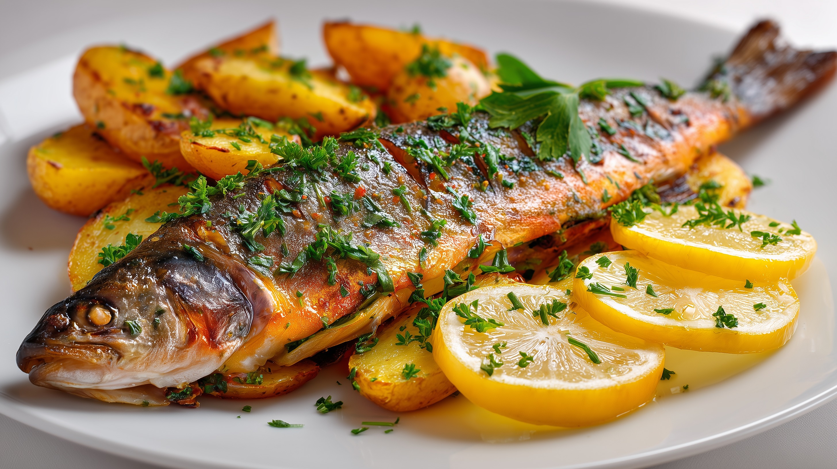 - Forellen auf vorgewärmten Tellern zusammen mit den Bratkartoffeln anrichten. Mit der restlichen gehackten Petersilie und dem Schnittlauch bestreuen und mit den übrigen Zitronenscheiben dekorieren.