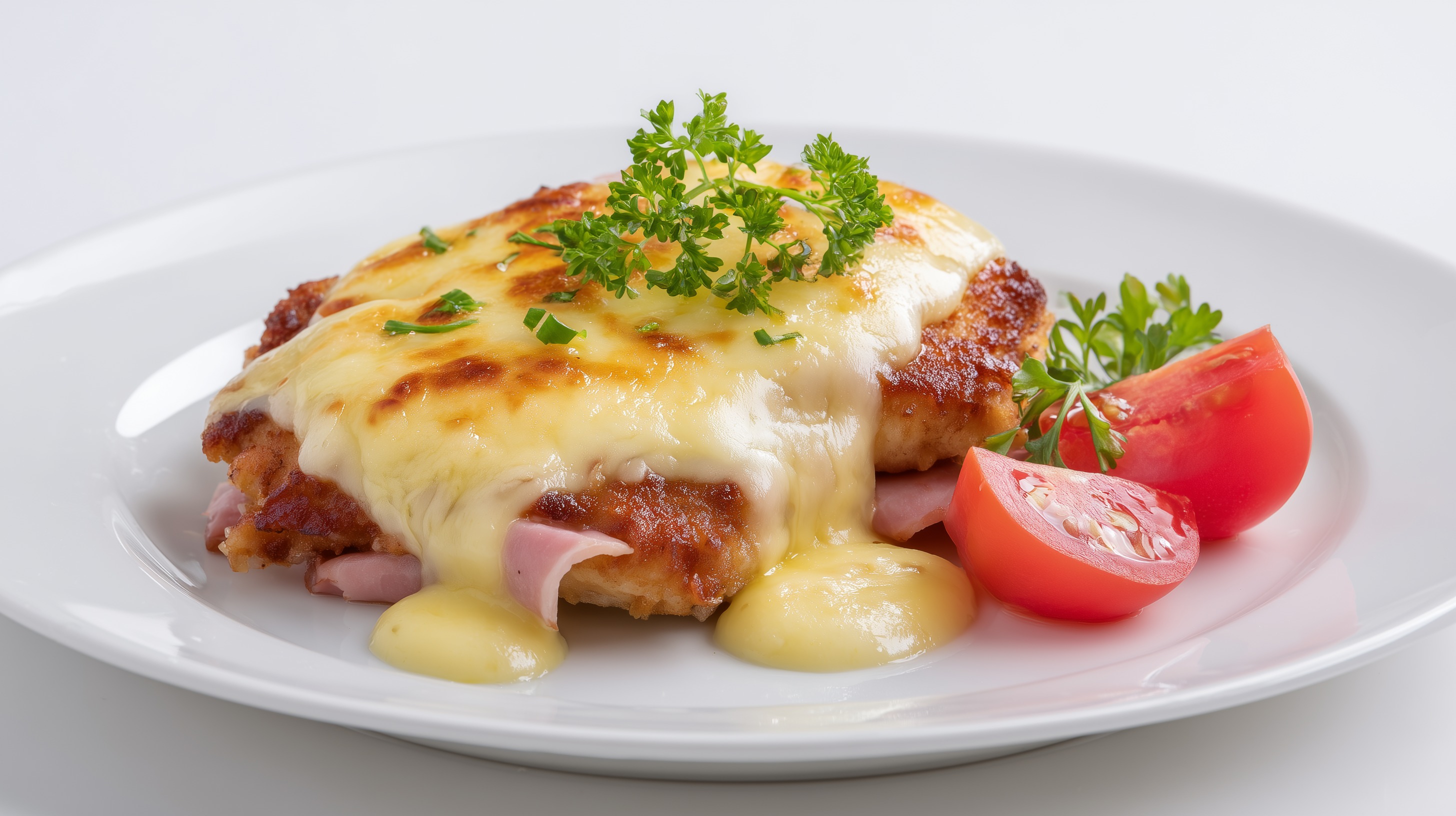 - Die Schnitzel auf vorgewärmten Tellern anrichten, mit Tomatenspalten und frischer Petersilie garnieren und sofort servieren.