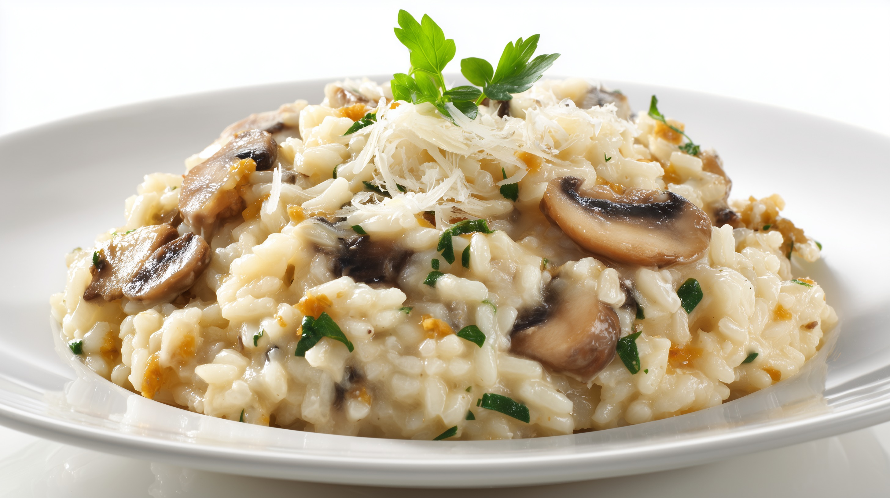 - Das Risotto auf vorgewärmten Tellern anrichten, mit dem restlichen Parmesan bestreuen und mit frischer Petersilie garnieren. Sofort servieren.