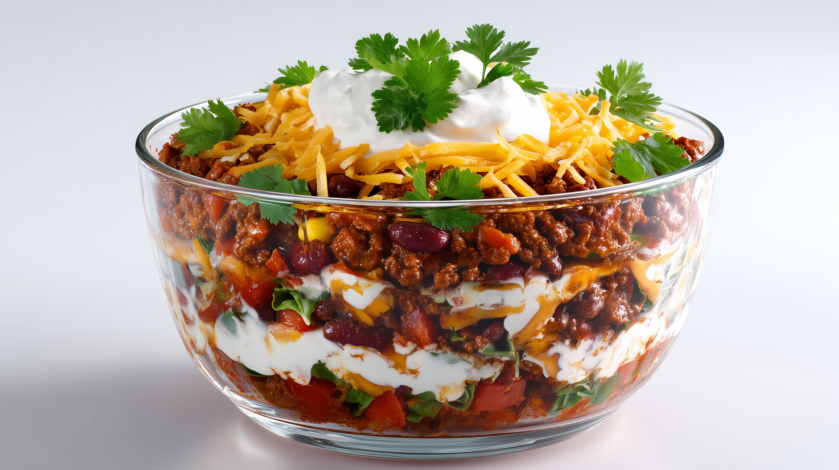 Tipp: Das Chili lässt sich hervorragend am Vortag zubereiten – so ziehen die Aromen noch besser durch und der Schichtsalat kann problemlos über Nacht im Kühlschrank ruhen. Wer es schärfer mag, gibt einfach eine frische Chilischote oder etwas Cayennepfeffer zusätzlich ins Hackfleisch. Dazu passen knusprige Tortillachips zum Dippen.