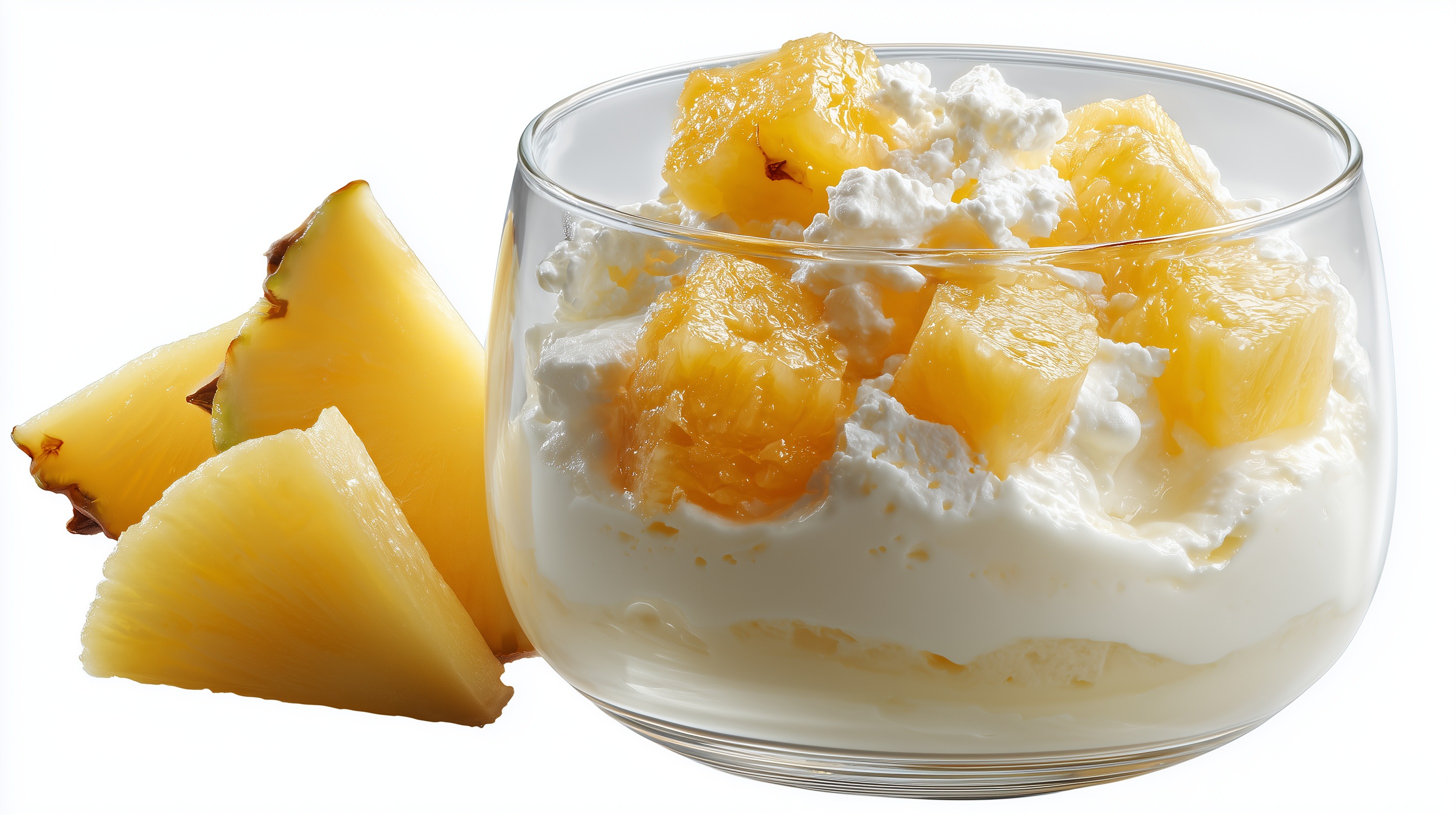 Dieses appetitliche Foto zeigt eine cremige Ananas Quarkspeise, angerichtet in einem klaren Glasschälchen vor weißem Hintergrund. Die Speise besteht aus luftig-weißem Quark oder Frischkäse, der mit saftigen, goldgelben Ananasstücken garniert wurde. Die glänzenden Fruchtstücke verleihen dem Dessert eine tropische Note und sorgen für einen schönen Farbkontrast.
